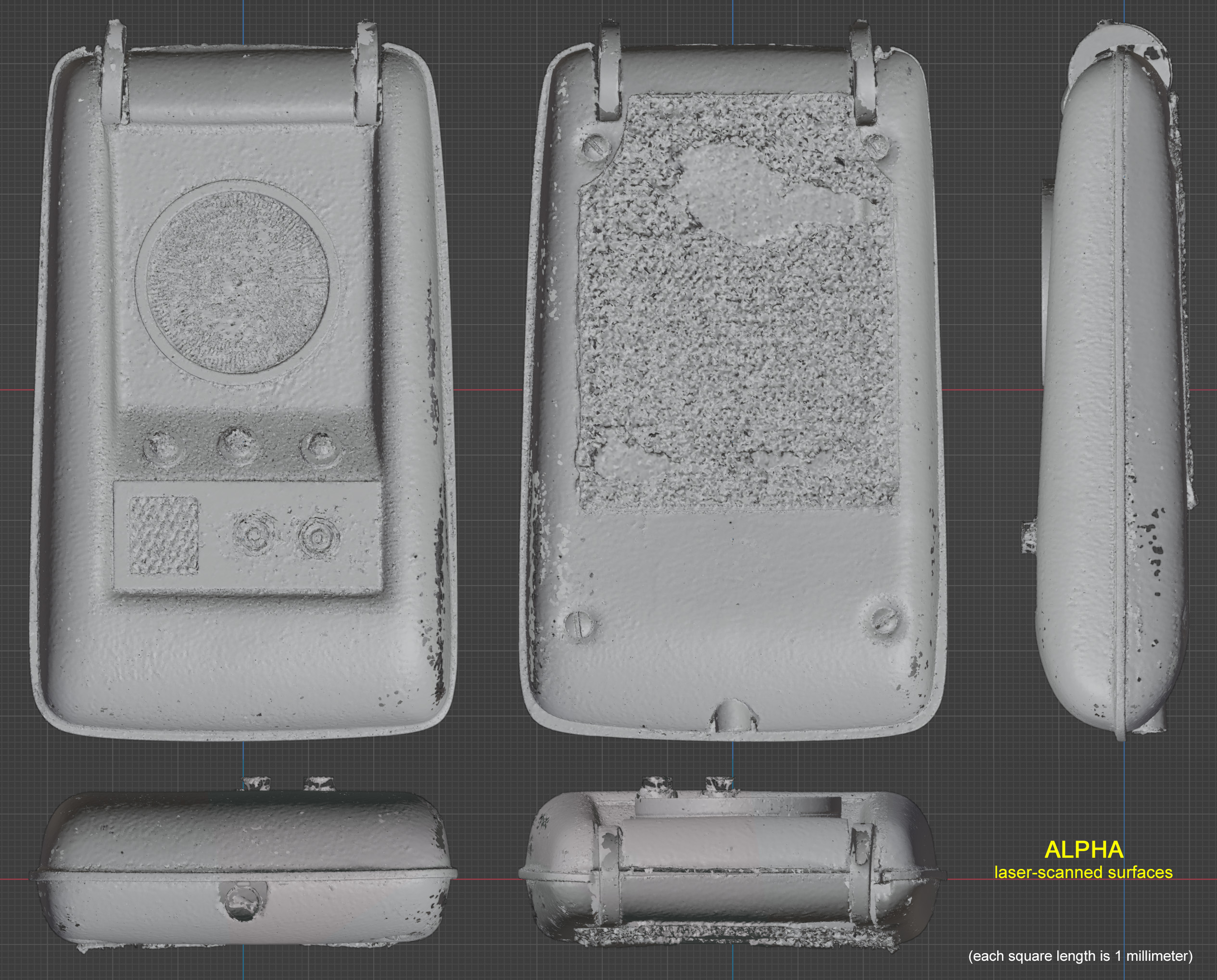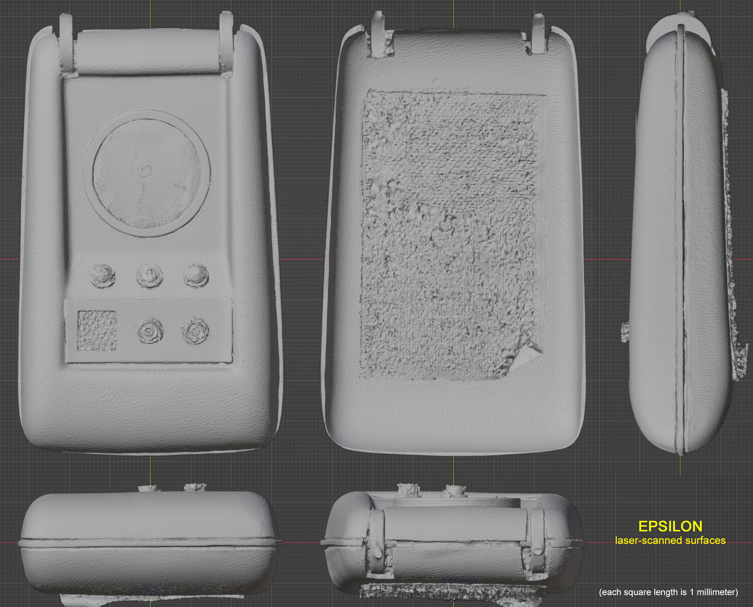 link to detailed "Parts" page) HC note - we have not performed a chemical assay to determine if the shells are actually Kydex or any other plastic, such as ABS (also available in 1966). Past experts have unequivocally called it as Kydex, and to be sure it has that plastic's distinct appearance and feel. As such, we have no reason at this time to say otherwise. Myth: The bucks were hand carved by Wah out of clay or wood. Truth: False. Partial circle imprints in the inside of the bottom shells are precisely sized and located where circular "feet" on the Sterling pencil box also appear. Plus each and every odd zigzag in the control well's edges (callled here "wanks" - and, yes, our British friends, we know what that means there) that had defied explanation for decades can be perfectly recreated by simply assembling the cut-up pieces of the box just as Wah did. More on this here. It was reported that Wah's recollection later in his life was that he did not perform the actual vacuforming; that he farmed that specific task out. While it is true that he did remember some other details of his early work incorrectly, the specialized equipment, plastic stock and skills required for vacuforming are not common in your average craftsman's shop, thus this occurrence is likely factual. Every bit of evidence shows that the Kydex's faint "haircell" texture runs left-right in each and every shell. Myth: Some shells were glossy smooth instead of textured. Truth: There is no evidence that any were smooth. In fact HD screen caps prove in most and strongly suggest in the rest that all had the same light haircell. The origin of this myth is likely from earlier low resolution pics, which didn't pick up well the subtle texture. When filmed outdoors, the sky's expansive brightness could even create the illusion of a glossy shine on the comm when the images are at standard DVD size. Now while it is true that the Kydex sheets were textured on one side and smooth on the other, it seems Wah (or the shop that vacuformed for him) was fully consistent with the orientation. This subject is discussed at greater length and with photographs on this page. Myth: The Kydex used was dark grey. Truth: Nope. All were black, probably the only color offered in Kydex's first two years of availability. The shell shape, with an average maximum length./.width of 4.10" x 2.48" - close to the Golden Ratio of 1.618 - is quite complicated, as there is barely a set of straight or parallel lines in the whole thing. Nearly everything rounds and tapers, as you can see in these 3D laser scans (courtesy of The Wand Company): Click on each for a high-rez, printable-to-scale version. And here's some sections from those scans (the Velcro on the back makes much of the bottom "fuzzy"):