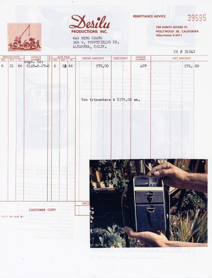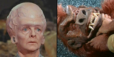 (HC note of preceding picture - the illusionary monster under Pike's hands looks to be the same mask as above in The Outer Limits, without the bulging eyes.) Chang applied his skills to the show by making the iconic "Balok" effigy, the fake alien head in "The Corbomite Maneuver" - frequently repeated as part of the closing credits - with its small chin, almond-shaped eyes and large cranium that did much to establish and popularize the archetype of humanoid extraterrestrial life, in addition to the two pulsing "light bulb" ships in that episode. He also created the creature costumes for the M-113 "salt vampire" in "The Man Trap" and the Gorn in "Arena," along with the Taurus II humanoids in "The Galileo Seven." Chang also made the Vulcan harp and the original Romulan bird-of-prey seen in "The Balance of Terror," which inspired future designs in Star Trek: The Next Generation and was re-envisioned in the Enterprise episode "Minefield." Also seen in "Balance" were his Romulan ears and Centurian helmets (later painted silver for Vulcan helmets in "Amoke Time"). Certainly one of his most popular creations was the tribble, which he made using artificial fur stuffed with foam. And he launched the fantasy aspect of "Shore Leave" with the rabbit's head seen at the beginning of the episode. This comprehensive list of his services to Star Trek comes from the purchase orders on file with UCLA archives. Owing either to their severe budget cutbacks or Desilu's purchase by Paramount (or both), the Star Trek production staff did not use Wah's services after the middle of Season 2. Another interesting costume job required Wah to design and fabricate various pieces for the apes in "The Planet of the Apes." |