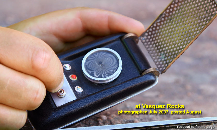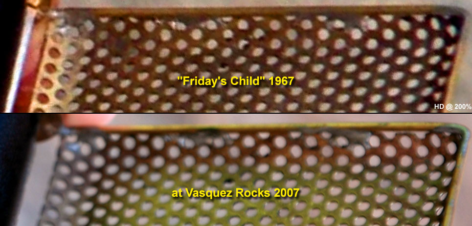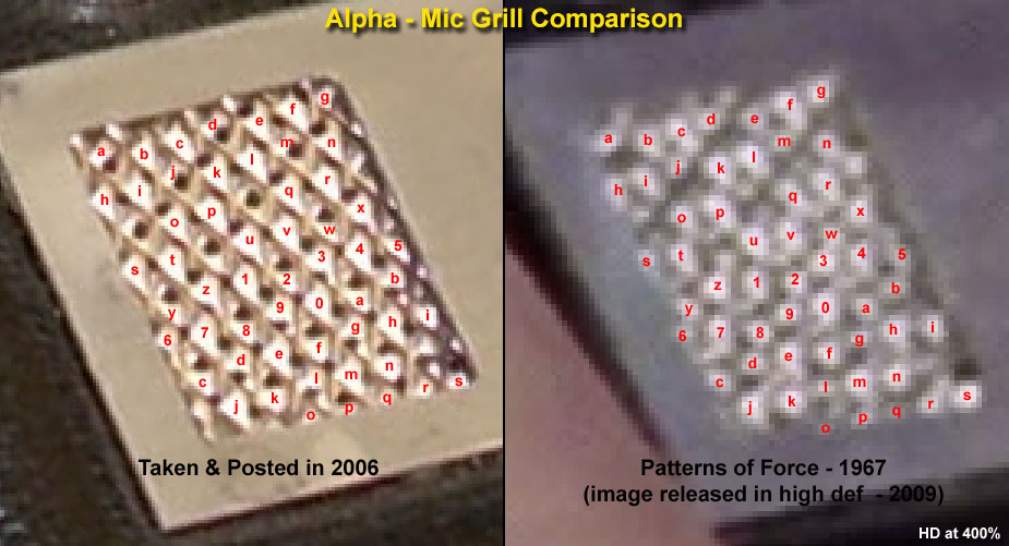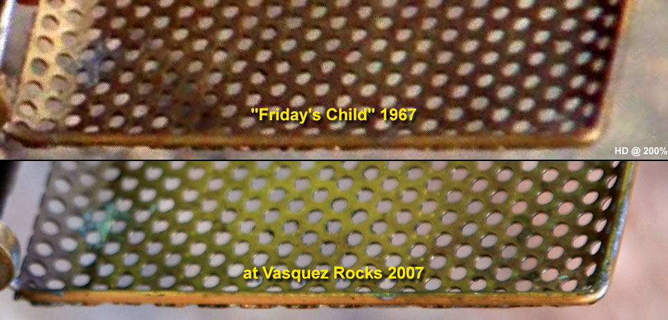 This image is not as sharp and in-focus as that from Friday's Child, with scant mappable Kydex texture or antenna solder. But it does show one prominent feature that can be compared to the found Alpha of today... the mic grill. We've previously made exhaustive study of the transistor radio grill Wah Chang used in his communicators and tricorders with a hereto before unknown ultra-rare variety of mesh. The bright and dark patches from the constantly-changing interaction of holes and diamond peaks/valleys act as their own unique fingerprint suitable for use on any possibly-found original comm presented prior to our radio source discovery in 2007. This very mic grill was already confirmed by using a modern photo vs. the old "Patterns of Force" standard DVD screencap. But how does yet another modern pic, this one taken and posted as one of the first batch in December 2006, look up against Blu-Ray HD seen for the first time just two months ago?