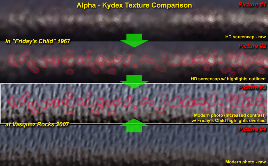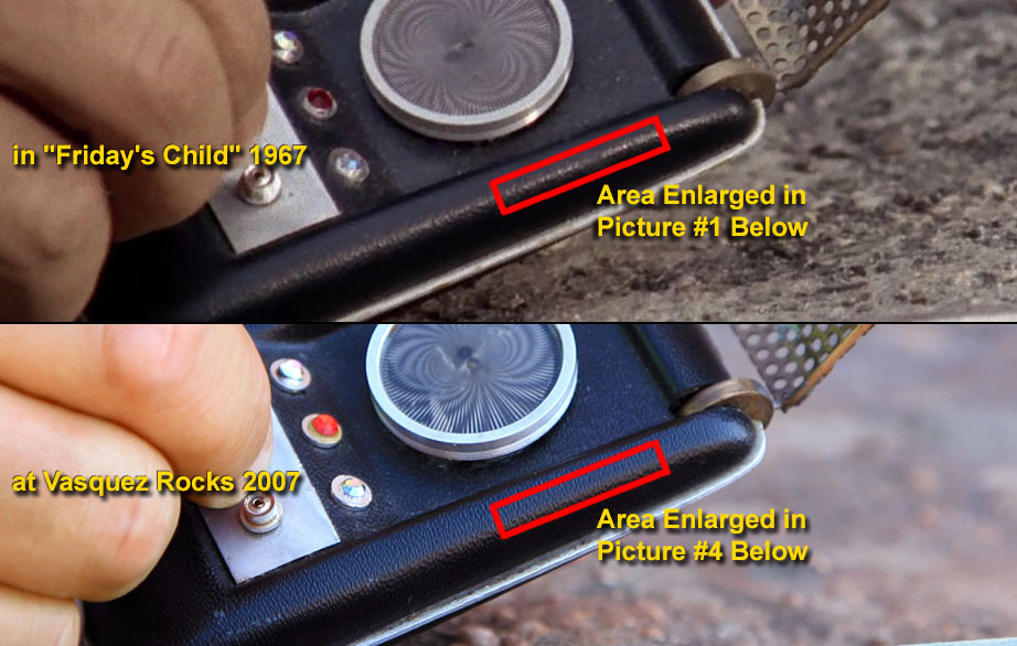 Here at last are the details we've been waiting to see in HD of the Alpha comm in its prime, with individual texture marks in the Kydex, the tiny moire and jewel features, and the precise antenna solder marks. We can compare this image with that taken in the summer of 2007 at Vasquez Rocks, where the recently re-found Alpha was taken to recreate its famous pose: Let's zoom in on just one inch-long length of shell with texture highlights... ... and see if two match up. The bright spots of course can only come from high points in the texture. Observe how each one from the 1967 screen cap, ringed in red, is sized, angled and swerving around the pits when laid upon the 2007 photo. This level of detail is impossible to forge and was completely unknown until just two month ago. Since the recent "Alpha revisits Vasquez" photo has been up for more than two years and presumably downloaded to countless hard drives around the world, it serves as a tamperproof snapshot of its current appearance. That such an absolute 100% match could be made of random Kydex texture, even under less than identical lighting conditions, is actual proof these objects are one-in-the-same. These results could be easily duplicated by any authorizing body associated with a major auction house. The "debate," such that it ever was, about the authenticity of the prop is over. * * * * * * * So do the new screen caps show more? Naturally, yes. Next is a focused look at the antenna from the same two photos, separated in half for easier comparison. A more perfect matching of holes, solder, and even the embedded dirt that stuck in the holes after years of banging around could not be imagined. First the left half: