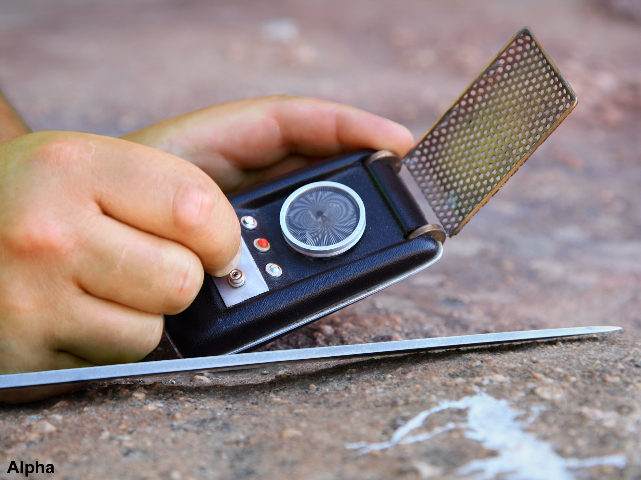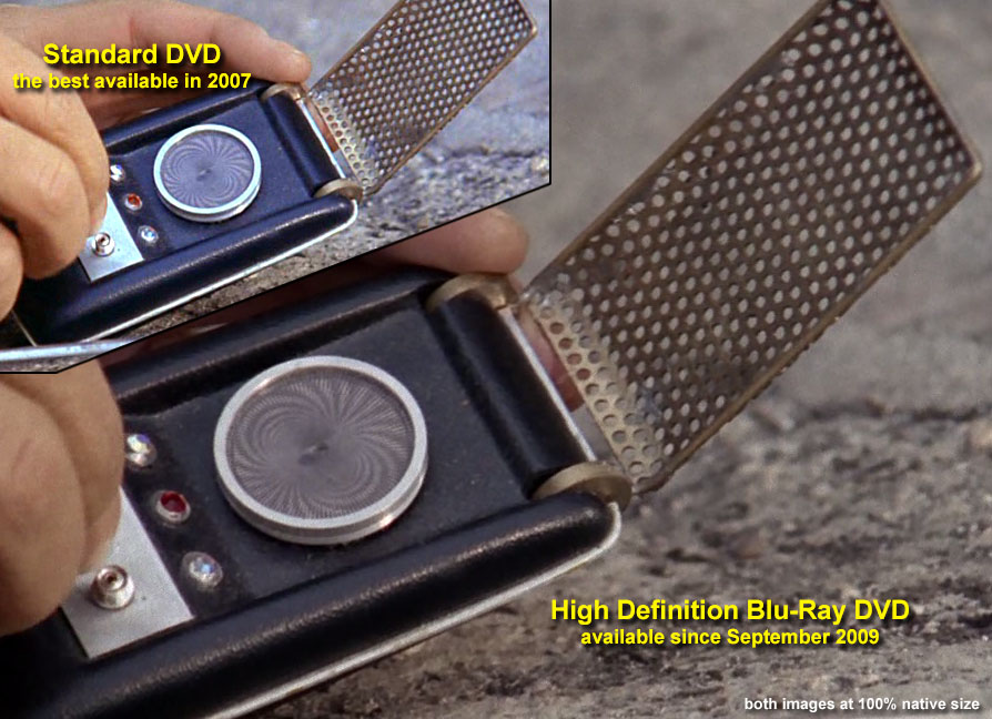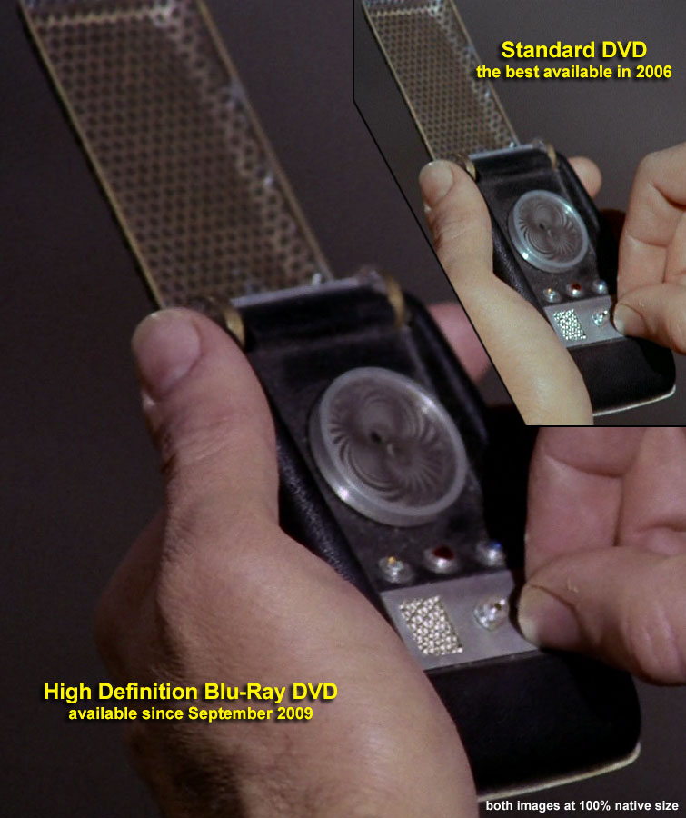 Spring 2009 - For the last three years, we have written page upon page here detailing the mountains of rock-solid evidence that unequivocally confirms the found Alpha hero communicator to be absolutely authentic, compiled to eliminate all manner of possible doubt for a topic so vital to the hobby. But technically all we've shown before has been "evidence," and though overwhelming and unambiguous, it nonetheless could leave room, however miniscule and absent of merit, for a habitual cynic to still feel cause to object. Until now. Below is the first actual proof... honest-to-goodness courtroom-ready forensic "proof" - as irrefutable as clear fingerprints on a gun handle. Paramount has finally released the Season 2 episodes on high definition Blu-Ray*, and with them come screen cap images with a resolution 4.5 times better than previous standard DVDs (mouse-over & click below for the complete shot)...