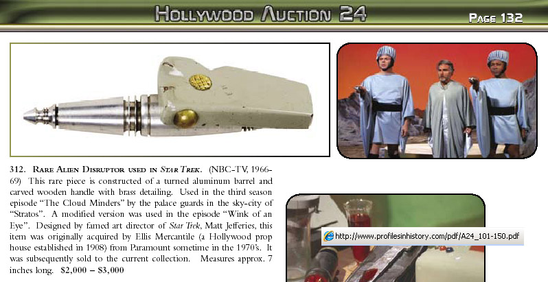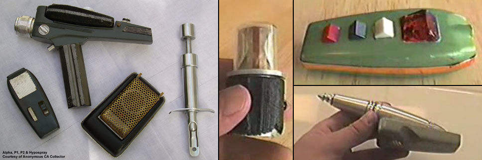 Wonderfully, we now have answers to a few pesky questions about the props. The P2 originally came with its clear tip; when it later broke off is long forgotten. The communicator's spinning moiré was still in working condition, and the yellow crusty crud on its Velcro was Harry's attempt at gluing a fresher piece of new Velcro to the old for better stick. No other repair work, such as replacing any lost screws, was done to the best of his recollection. As to why Harry put his SSN on the midplate, you old-timers will remember when the police suggested you tag valuables that way to make them easier to trace and return if stolen. It's that simple. In the mid-nineties he eventually got rid of the props and other artifacts from earlier chapters of life (a comic book collection went as well) when clearing house in preparation for a big move. And yes, the gentleman expressed to us some all-to-natural regret in letting them go too soon. * * * * * * It is a given, what with the casual friend-to-friend early gifting of these props, that no documentation corroborates Harry's or Jim's story. No one decades ago knew to sign off on each transfer of then-worthless used props, and employment records for Ellis would have been boxed, burned or tossed ages ago. Instead we have just the plausible testimony of two distinguished professionals (one of them a Hollywood veteran) that links the past to today via some numbers fortuitously scratched into aluminum. In searching for anything that sounded even remotely similar, we nicely found another Trek prop that also passed through Ellis Mercantile; in 2006 PIH auctioned yet another Stratosian weapon just like the one that came in Harry's little trove: The lost early chapters of the Alpha communicator and the other six props have now been uncovered. All that's left for the remaining four still with the anonymous west coast owner is their final postscript, which has not yet been written. In conclusion, it seems reasonable to figure that the history of the props immediately after the show's cancellation is a lot more complicated than merely them all ending up in a Paramount dumpster with some getting rescued. John Dwyer and Jim Rugg got a couple boxes, but so did the Ellis Mercantile company. Two other boxes filled with phasers and Klingon items ended up as unwanted "door stops" in the office of Back Lot Manager Russ Brown, who later gladly turned them over to Paramount financial representative Henry Renshaw (note - nearly all the contents were subsequently busted and pitched after being played with by Henry's young children). Finally we know that Gene Roddenberry kept a couple props that eventually got handed to various people over time. All told, given the many more diverse avenues out of the Paramount studio than previously thought, there is good cause to hope that other survivors are out there not yet rediscovered. |