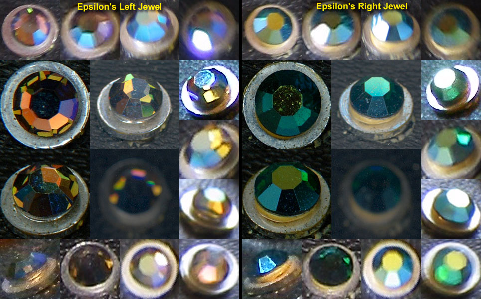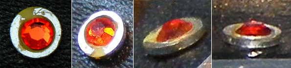With its orange tint and flashes of yellow, the center stone is clearly a 16ss Hyacinth, atop a Type C hub that's oddly had its raised back shaved down so the gem sits at the same level as - or is even sunk a bit into - the wide rim. We have no idea why Wah did this. The colors of the outer stones, both 20ss and AB-coated, needed to be determined by the photos we have of this prop, which fortunately are plentiful: The right