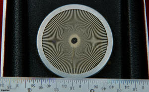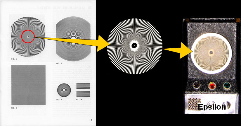 Wah cut this comm's Pattern #4 radial image from Page 9 of Edmund Scientific's The Science of Moiré Patterns book: The moiré bezel ring was once located lower in the control well than it is now. In This Side in Paradise, late in Season 1, it's seen near the bottom fold. The residue of the glue that held it on then can be spotted on the shell today. We believe it is now more centered (after its GJ refurbishment) over the round hole Wah cut in the shell: