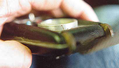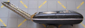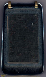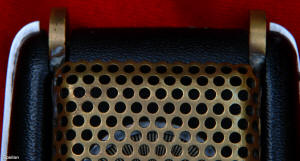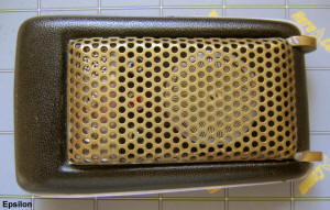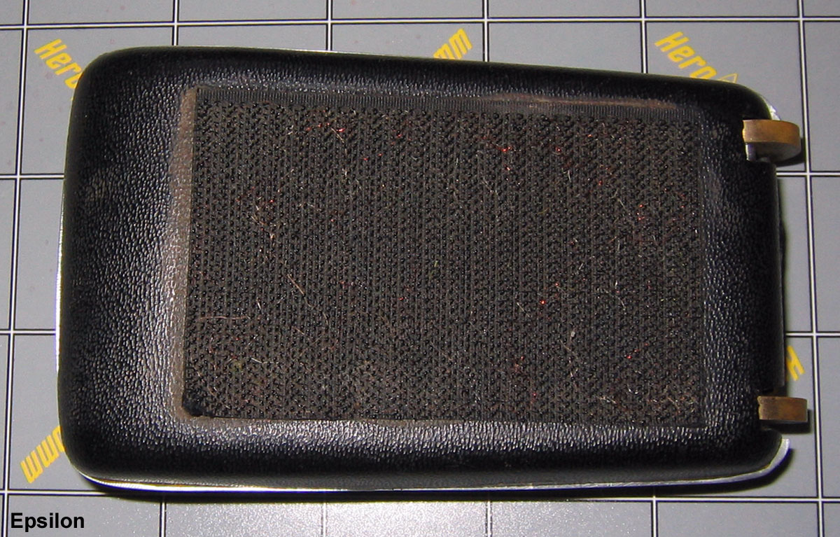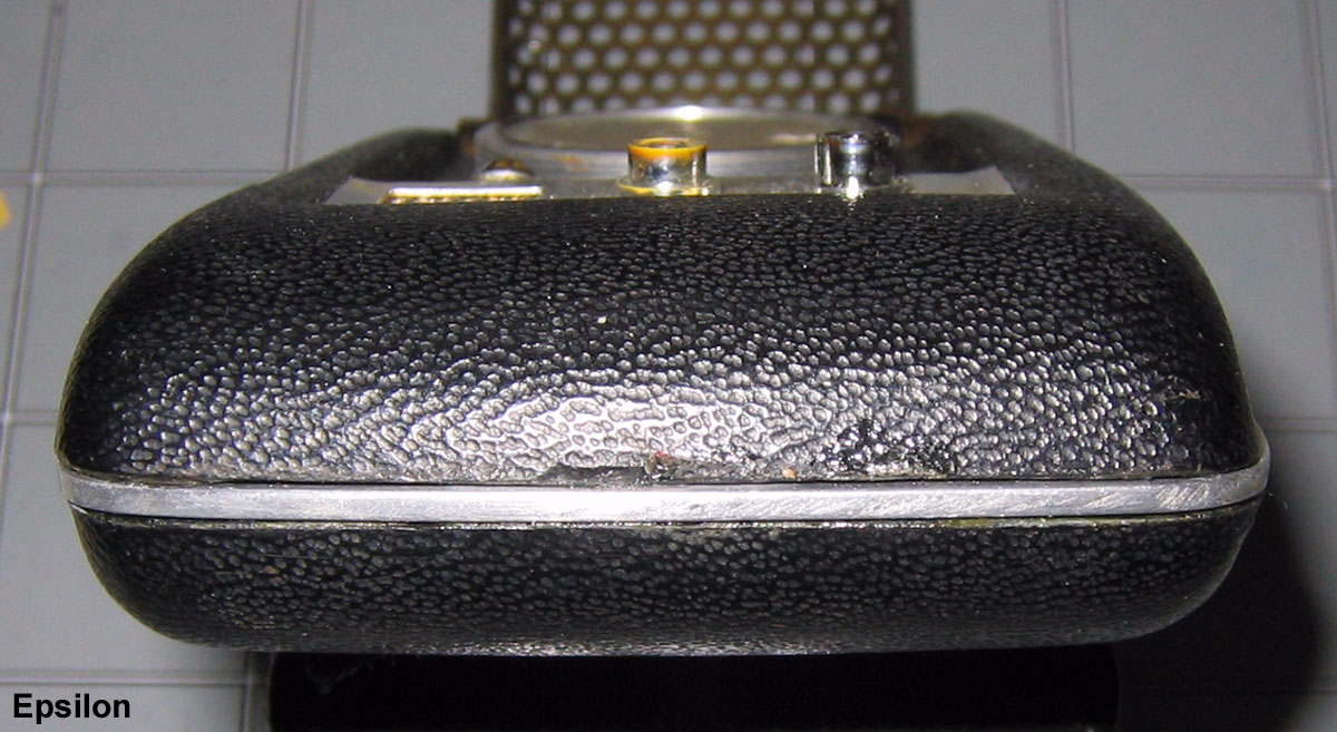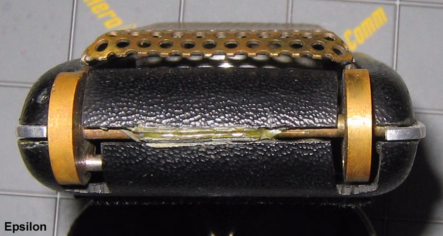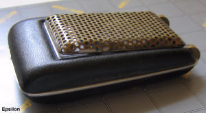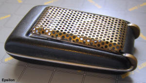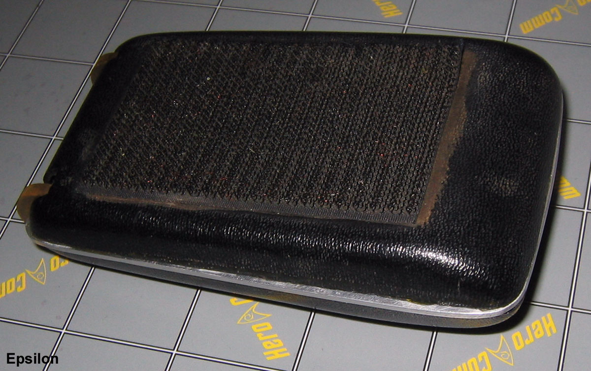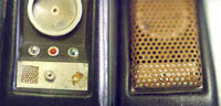 This is the only original out of the four known surviving comms whose antenna still flips open with ease as you're accustomed to seeing on the show. It stops firmly with a satisfying "thwack." Note a wide cutout in the lower shell for the antenna hinge wheels that allows us a good view at the hinge rotation stop pin. It's also the only found original without screw dimples in the back shell. The mic grill material has the pattern's diamond peaks in the usual upward (convex) orientation. |