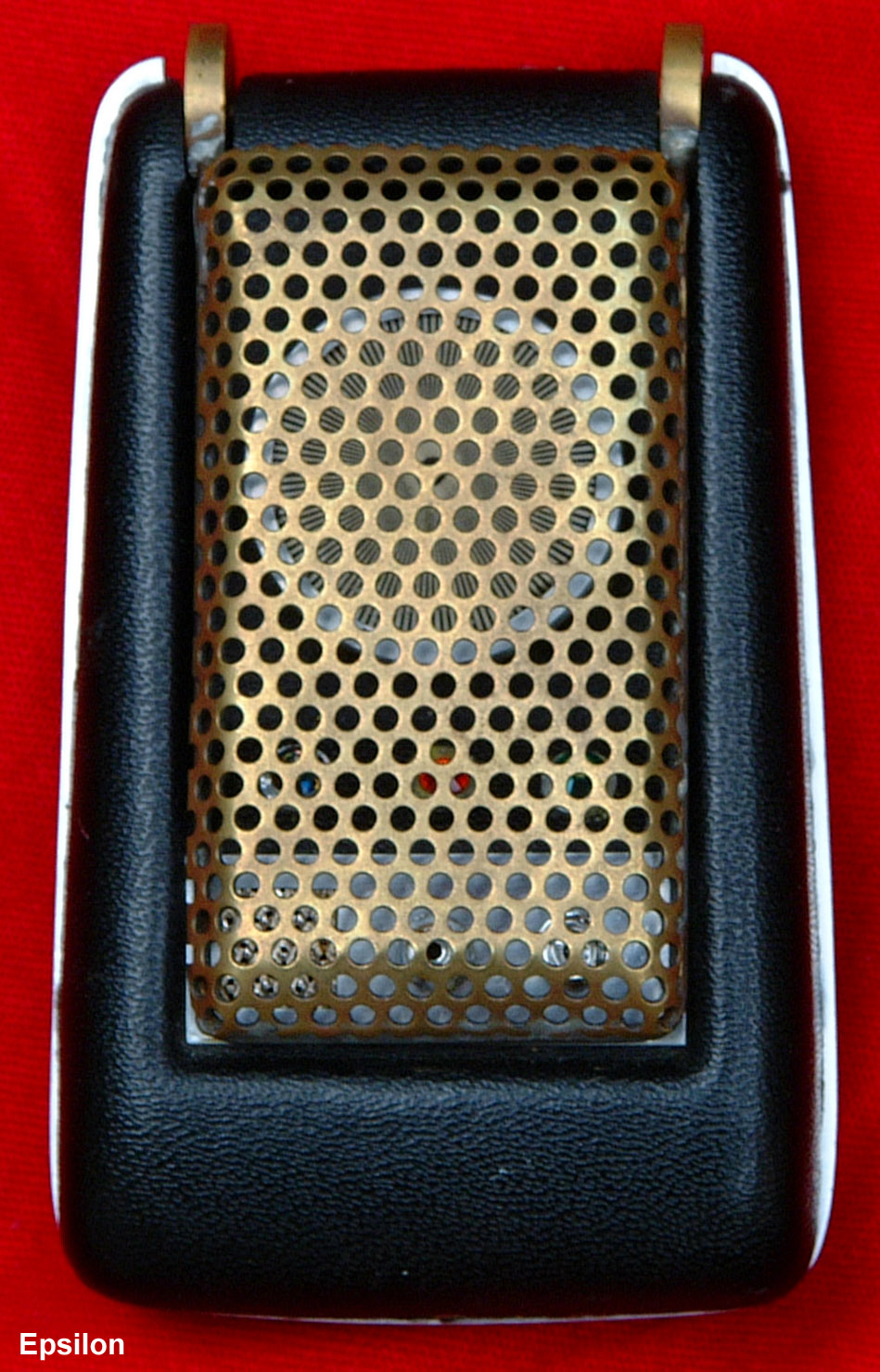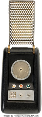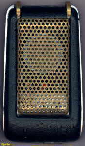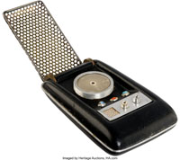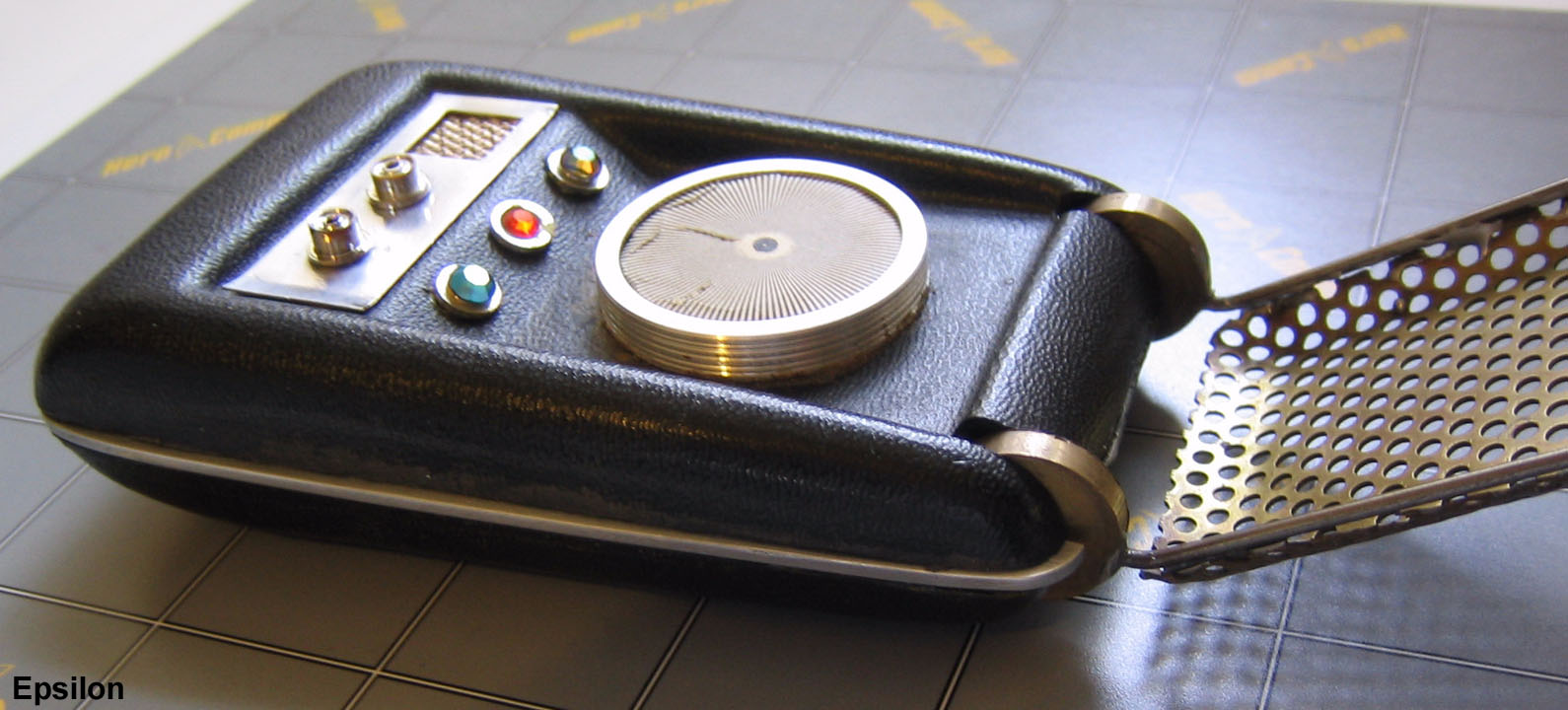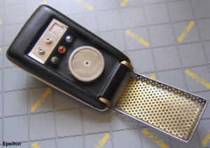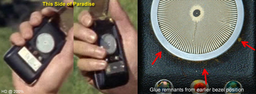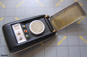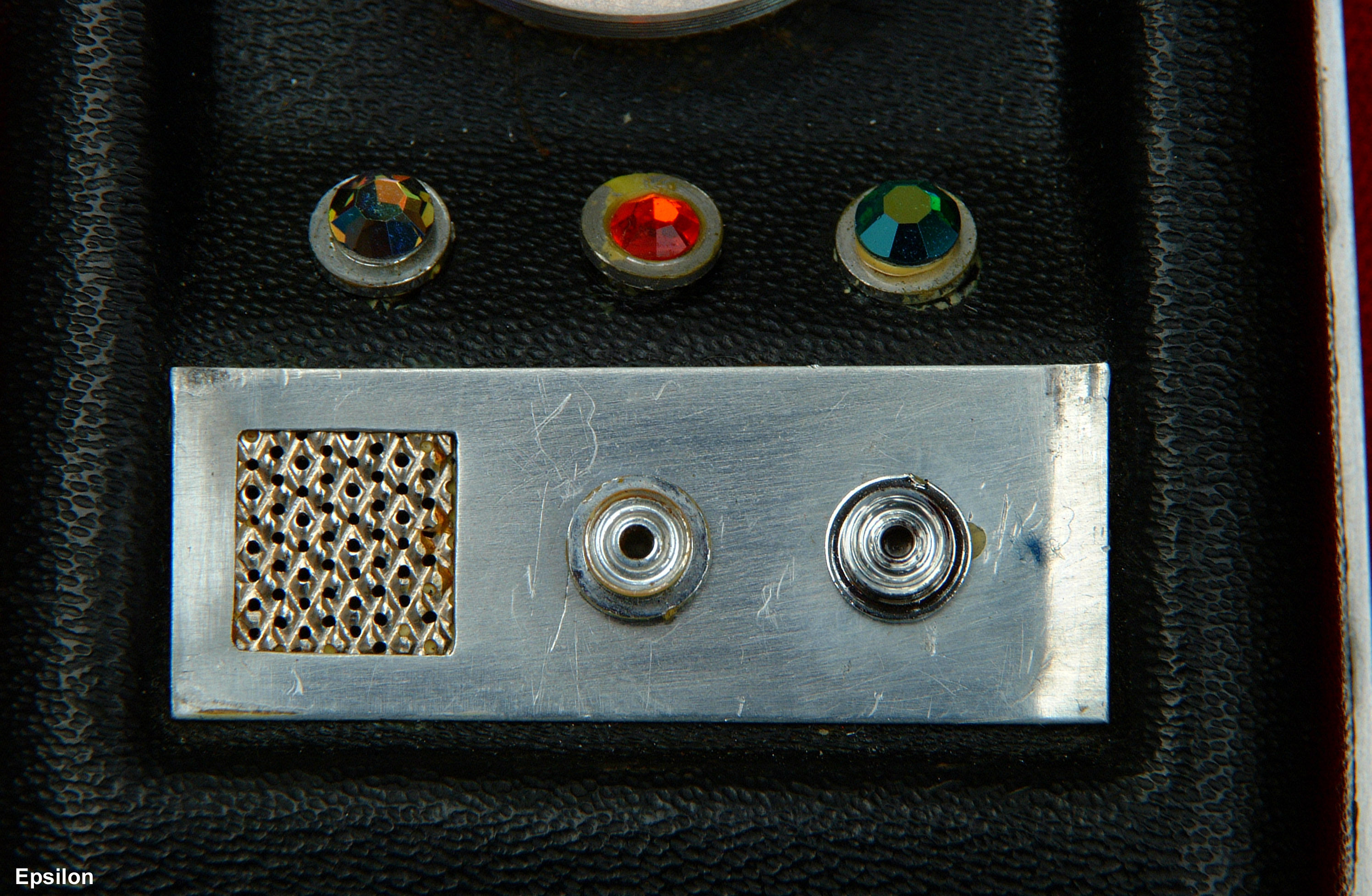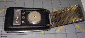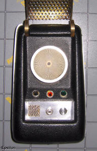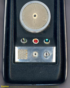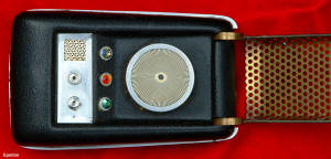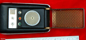 This communicator seems to have been among the cast's favorites as it was used aplenty in the show. Thought from the start of Season 1 it had a big tarnish blotch on the top surface of the antenna, making it easy to spot on screen. By the third season, the paper moiré pattern was pushed in at the upper-left corner. Then sometime later, it also lost its right knob. This comm was one of four that Set Decorator John Dwyer said he recovered in 1969 from a studio dumpster. Years later we heard he sold it to Mark English, from whom Greg Jein (through unusual means) acquired it. Mr. Jein refurbished the unit; the control panel was polished, a new knob (not the correct type) installed, the antenna got cleaned up and the paper moiré pattern was pushed back into position. |