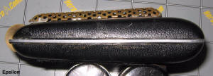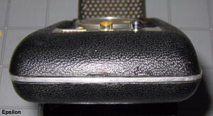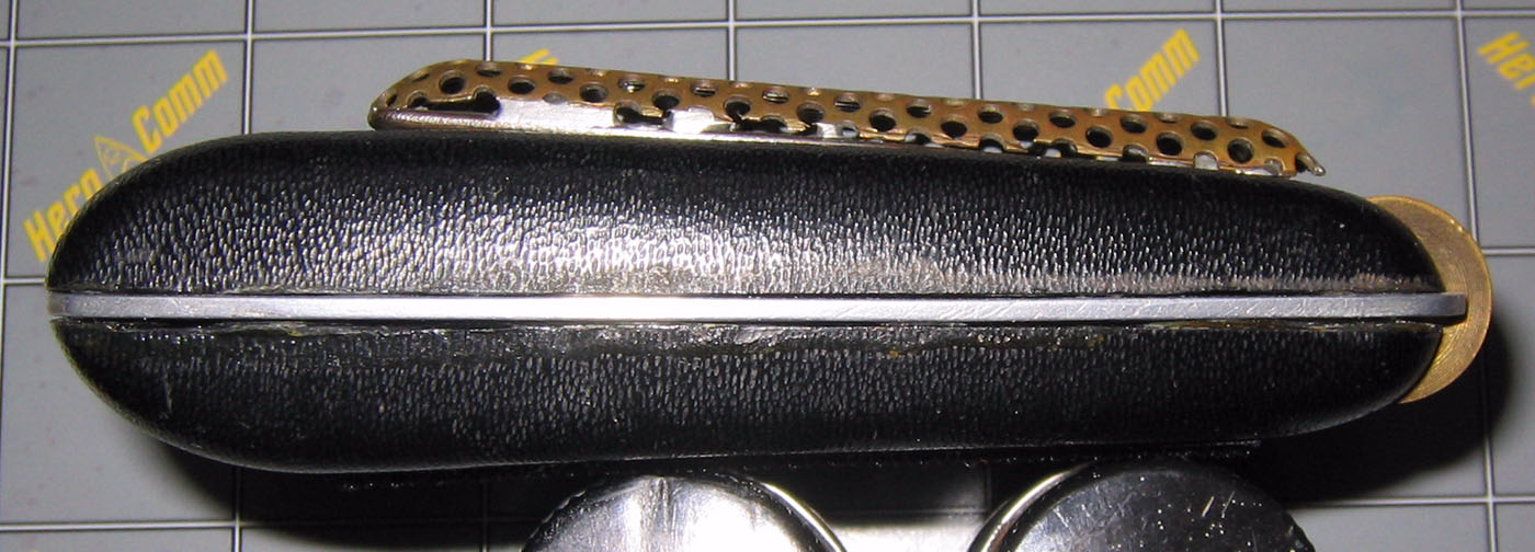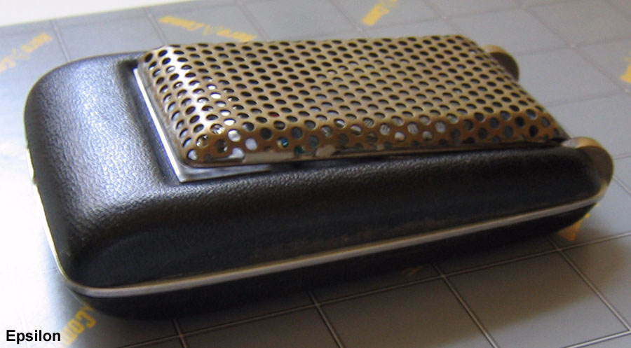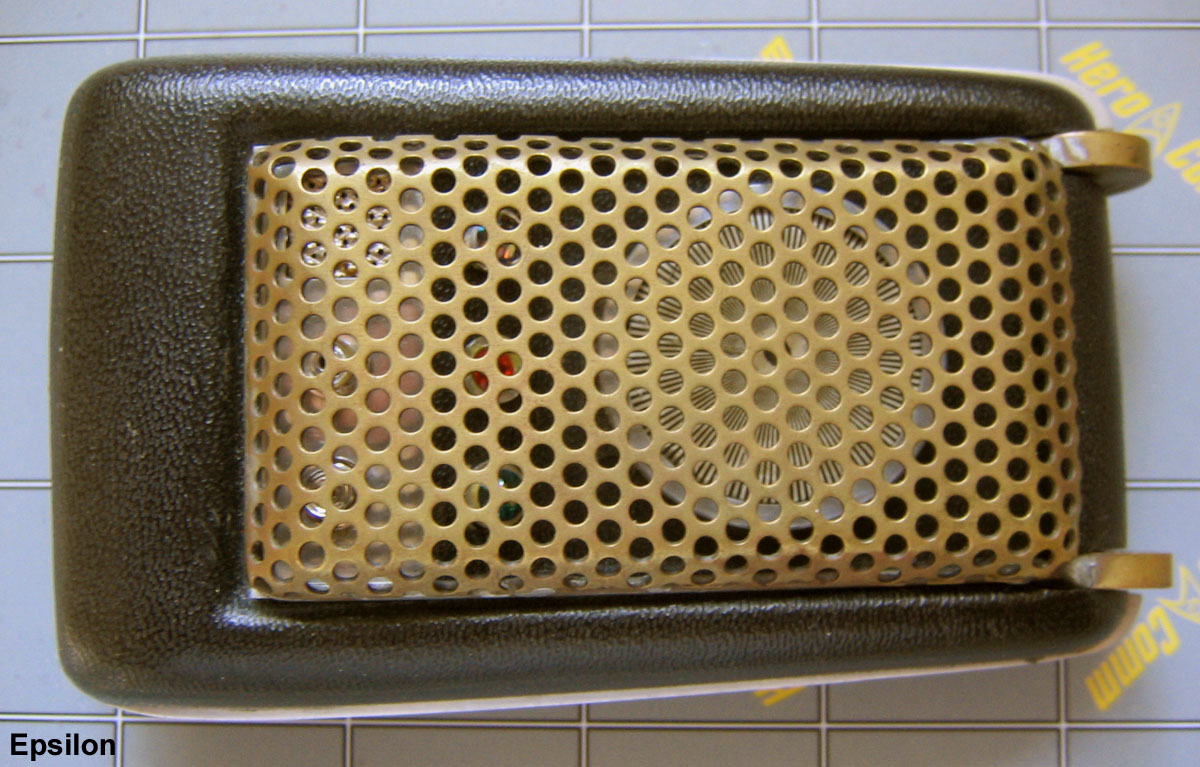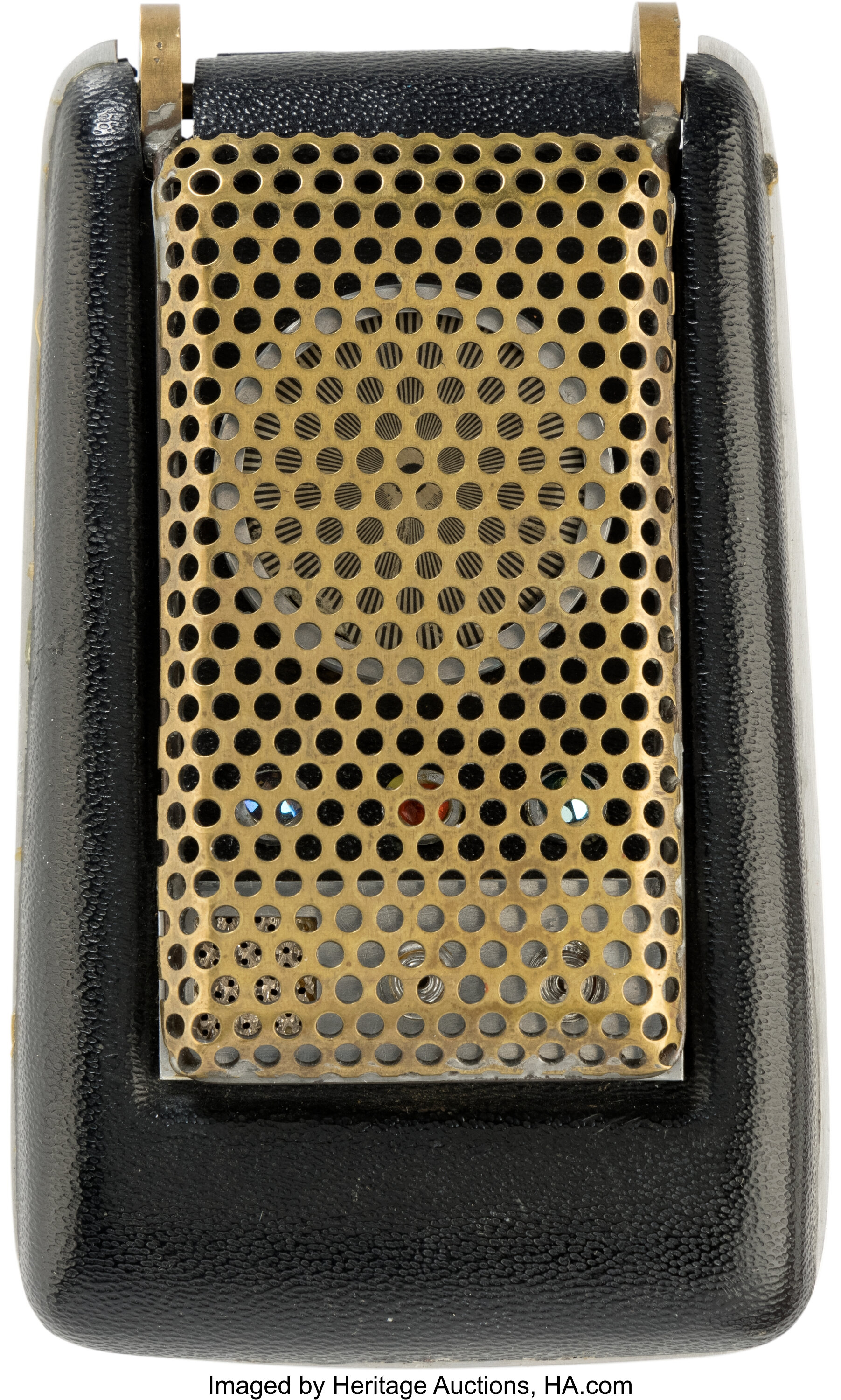 This communicator seems to have been among the cast's favorites as it was used aplenty in the show. Thought from the start of Season 1 it had a big tarnish blotch on the top surface of the antenna, making it easy to spot on screen. By the third season, the paper moiré pattern was pushed in at the upper-left corner. Then sometime later, it also lost its right knob. This comm was one of four that Set Decorator John Dwyer said he recovered in 1969 from a studio dumpster. Years later we heard he sold it to Mark English, from whom Greg Jein (through unusual means) acquired it. Mr. Jein refurbished the unit; the control panel was polished, a new knob (not the correct type) installed, the antenna got cleaned up and the paper moiré pattern was pushed back into position. |