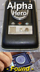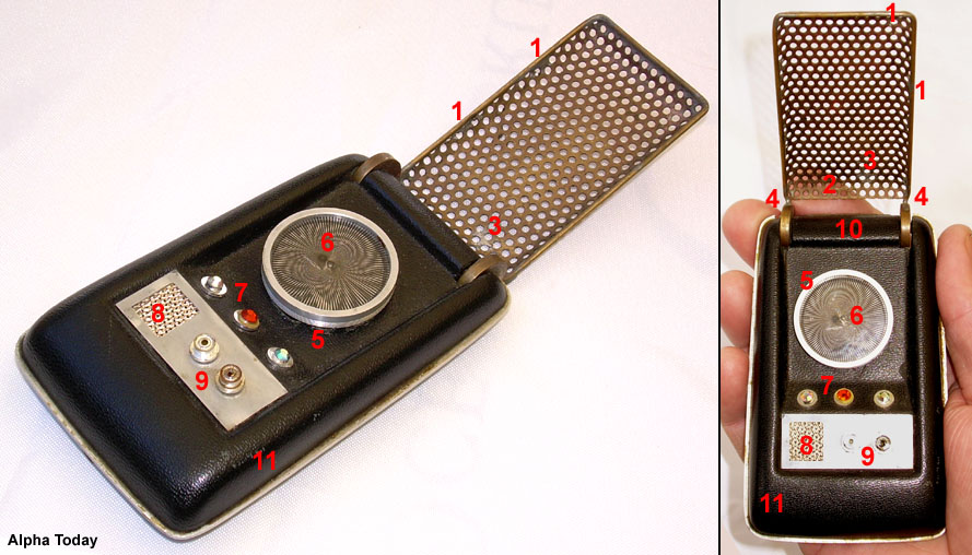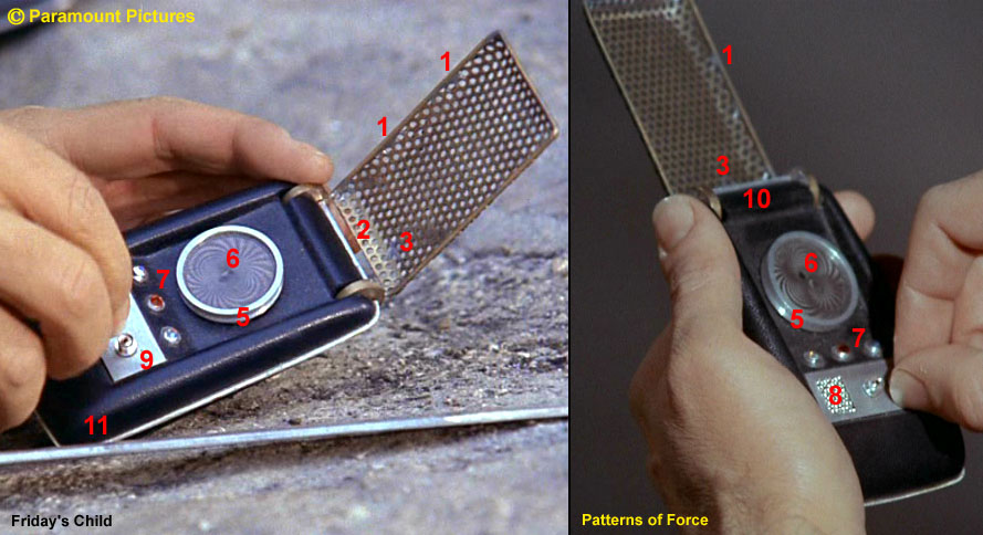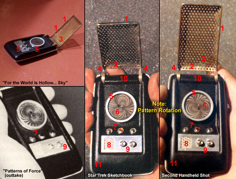 The spectacular close-ups in Friday's Child and Patterns of Force, and even its lesser known appearance in For the World is Hollow..., show a wealth of information that can be used to make an unequivocal positive match. Here is a quick review of some highlights that connect screen caps with two later hand-held photos (both from the same session) and to how it looks today: 1. Antenna Solder - as individual as fingerprints, we see a perfect match at every point. 2. Antenna Back Edge Holes - cut along the solid part of the brass perf with just the slightest hint of the next row of holes showing. 3. Antenna Solder Splat - a unique feature to Alpha; a small smattered drop of solder on the inside between the wheels. 4. Antenna Wire - an inward bow just as the wires enter the hinge wheels, again something so far unique to Alpha. 5. Moiré Bezel Ring - ever wonder why there is brightness at only the bottom of the ring? Maybe not, but we have. Four mini grooves there make it so. Also the thinnest rim yet seen. 6. Moiré Pattern - a full 2-layer moiré (seen from screen caps in only the two heroes), with the inner rotating pattern quite a bit smaller than the bezel ring, leaving a dark circle around the outside of the pattern. The top transparent layer also has a white patch just off center. 7. Jewels - besides the obvious match in colors, the left bezel is mounted higher on the slope and the middle bezel is off-center to the left. 8. Mic Grill - a tall rectangular hole with the lower edge angling slightly down as it goes left to right. 9. Control Knobs - out-of-line and very close to each other, leaving a larger than normal blank patch of control panel on the right. 10. Back MidPlate - it is clearly shown in both big screen caps, and yet is absent in today's Alpha (and in the "Sketchbook" photos too). That's simple; just like with so many of the other communicators, it eventually fell out. In fact, it looks to be already half-way in the process of doing that in "Patterns of Force" with it sticking out almost the full distance of the hinge wheels. 11. Midplate - a nice even 1/16" exposed all around, never trimmed close to the shell as we have seen in so many others.