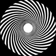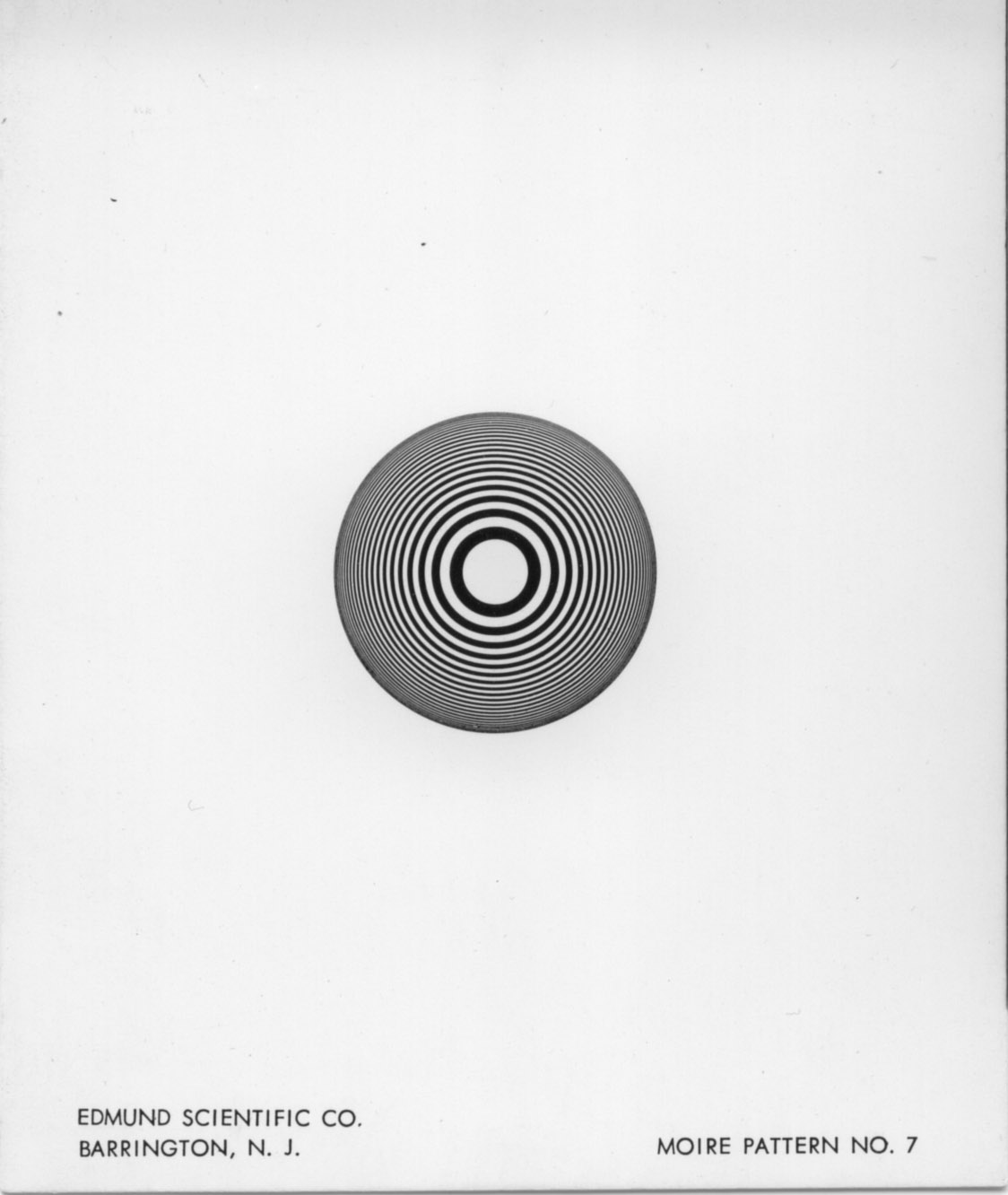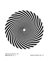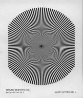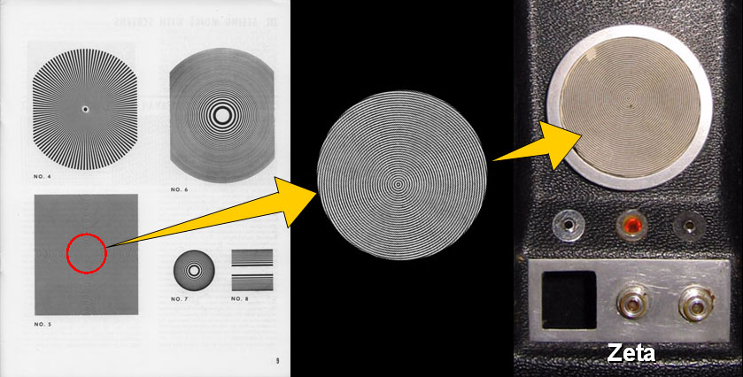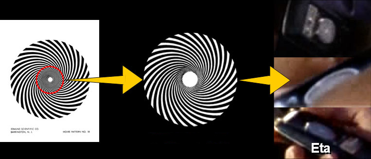 Like with Zeta, Eta got almost no airtime whatsoever. Just a few hard-found distant glimpses inside are all we've got to go on: Still, that white spot in the center of its moiré image is so unique that, given its size, it could only have come from one source within the pantheon of Edmund Scientific products: the Pattern #18 (called a "30-line logarithmic spiral) printed on glossy Kromokote cardstock from their second, lesser-known "Series (B)" kit of Patterns #11 thru 18: