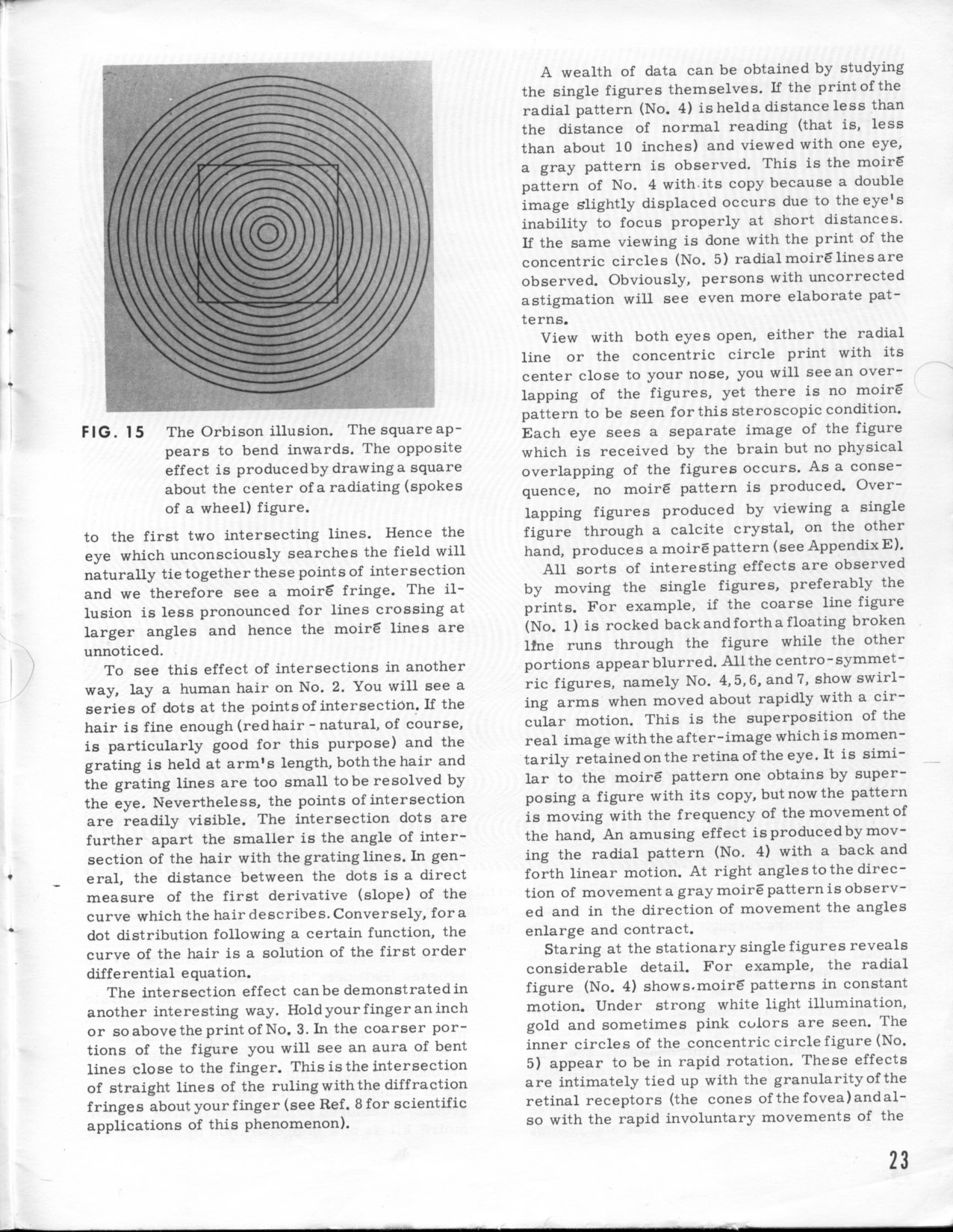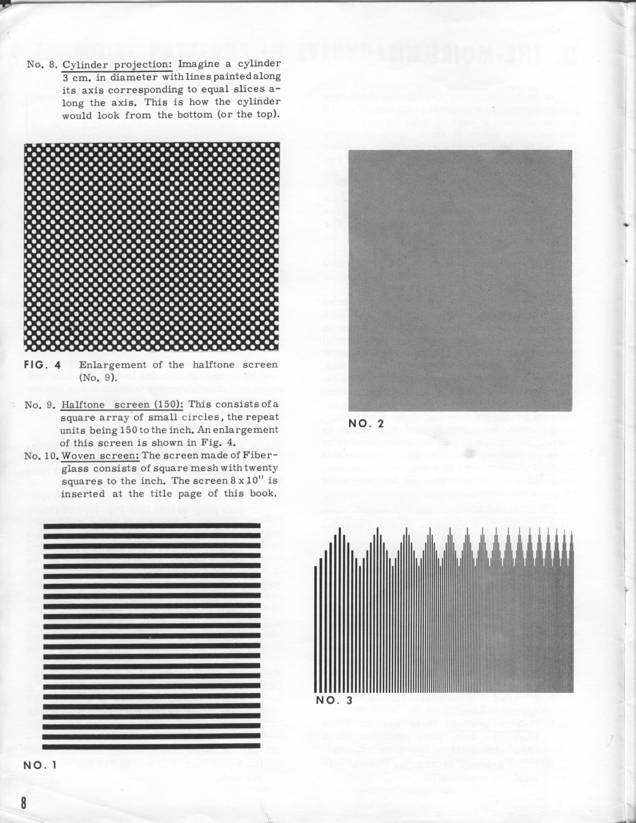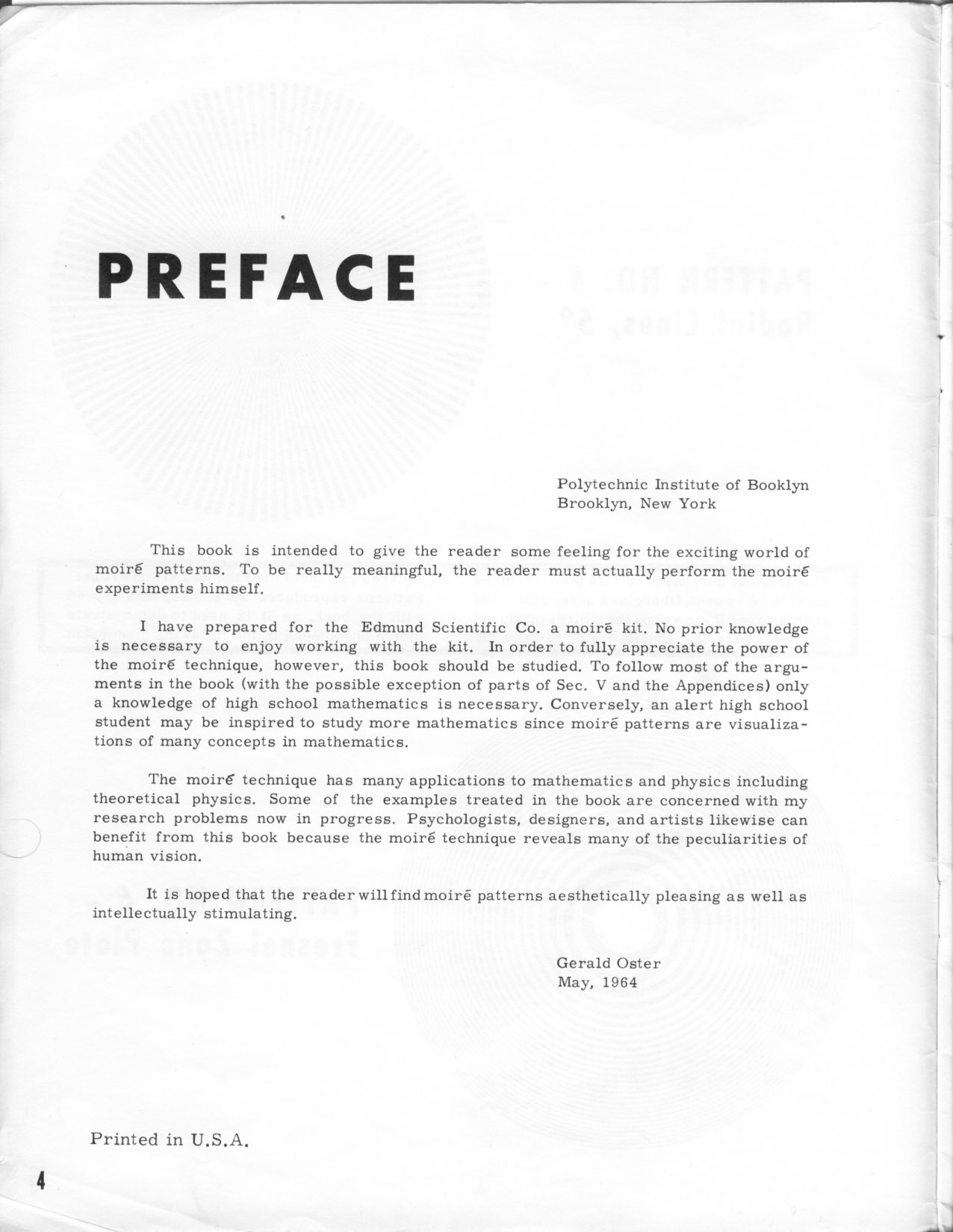 * * * * * * With the #4 pattern established as his hero model, Wah looks to have scrounged for extra similar images to put in some of his eight static dummies, so he turned to a related source. To accompany Edmund Scientific's moiré kit, Dr. Oster also wrote a short technical guide book called “The Science of Moiré Patterns,” copyrighted 1964 and selling for $2 at the time: