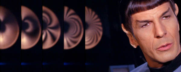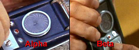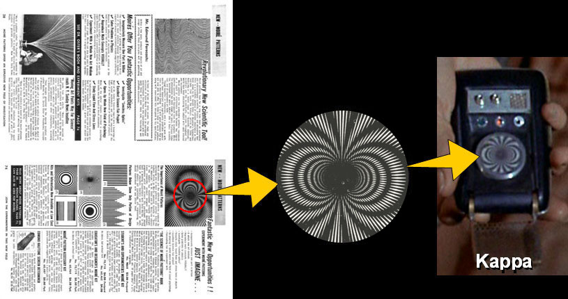 Their initial offering, first listed in the 1965 catalog on Page 74... ... was a "Student's and Experimenter's Moiré Kit" and similar "Educator's and Designer's Moiré Kit" (with thicker stock) of eight small patterns (3¾" x 4½" transparencies with matching cards). This first kit was called their "Series (A)": It also came with a reference book discussed more in detail below. Of the eight moiré patterns Dr. Oster first created, the one that seems to have caught Wah Chang's eye was Pattern #4 ("Radial Lines"), which when rotated atop another creates a fun "spider" effect of expanding and contracting arcs. When turned by a 30-second stopwatch, this became the dynamic effect in his two hero communicators. The image below is of an actual transparency & card; the red lettering is our: The distance the stacked images are offset influences the resulting moiré arc lines. Here with Pattern #4, observe that the closer the two centers are, the fewer but thicker are the lines, and the closer to the center the arcs can still be distinctly seen: The second (1/8") and the fourth (1/32") pics above are pretty much what we see in Alpha (averaging 0.118" apart) and Beta (averaging 0.023" apart), respectively: Another difference arises based on how you assemble the two layers. If you locate the center of the bottom (turning) layer well off the stopwatch's axis but the top (motionless) transparent layer is on-center, the arcs will grow and shrink, plus the entire spider pattern will rotate at the same speed and direction as the stopwatch. In essence you get two motion effects for the price of one! This is what we see in Alpha. If, however, the positions are reversed, such that the bottom layer is on-center and the top is off-center, the growing / shrinking arc patterns will stay pretty much fixed in the same orientation This is what happens in Beta. This difference can be confirmed by drawing a line through the arc axis of both. In "Friday's Child," Alpha's pattern rotates in the 4.5 second total clip about the expected 54 degrees. In Beta's only close-up, in "Day of the Dove," during about 2.5 seconds (starting while the camera is still zooming in) we would expect 30 degrees of rotation if it was built identical to Alpha, but instead there's barely any: Alpha