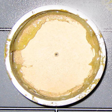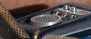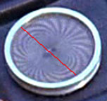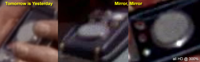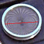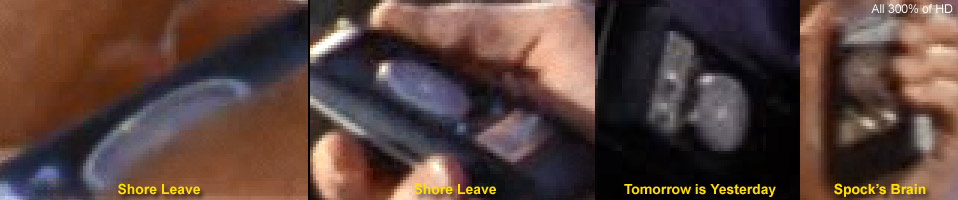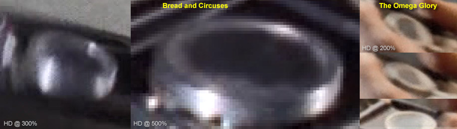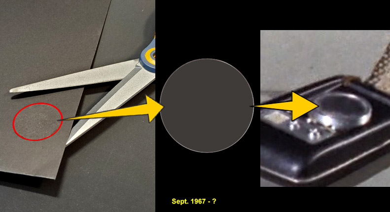 And notice how in every case, it's essentially featureless. It took all we had and a whole lot of dumb luck to unravel this mystery (that's told at great length on Theta's details page), but here we'll just cut to the chase... This prop had during the show two different inserts, and both were completely unusual. Wah first installed in the comm a newly-available novel moiré effect that came from two stacked samples of a thin prismatic sheet made by Rowlux that were included in alll Edmund Scientific "Experimenter's Moiré Kit with Booklet"s: Individually these sheets are unremarkable, but depending on their position against each other they can display an amazing range of various cells, dots, lines and swaths of bright/dark, while also often offering random sparkles as you move it around under light: Undoubtedly impressed with the material, Wah cut two 1-inch diameter circles out of the sheets, stacked and (presumably) oriented them to look cool, glued them together (with the glue not quite reaching the full perimeter) and installed the assembly in Theta's bezel ring: The one thing that can't be known with any confidence is what the exact original pattern looked like, as the limited images we have of the spot lack that level of firm detail. Then.... a year later, sometime before or during the shooting of the "Bread and Circuses" jail fight scene, the bezel ring came off and these sheets fell out. Upon hasty repairs, what was reinserted was some kind of matte black disk that either was freshly cut from (maybe) construction paper, or perhaps we're seeing the backing of Wah's initial multi-layer installation, and the repair guy in 1967 just put the assembly back in upside-down using an excess of glue: * * * * * * It will be an enduring mystery why Wah didn't use more of the transparencies and cards that came in the multiple moiré pattern kits he must have had. After all, some of those pattern combinations create awesome effects even when not being rotated, and the shiny top surface would at least have matched his heroes. We have to figure he simply had too little time, so after the complexity of Theta he must have went for convenience and just used a single paper layer in the rest. . |