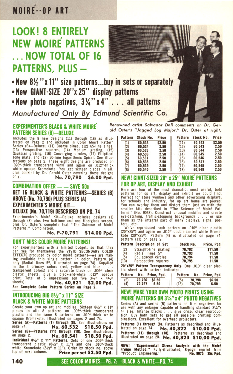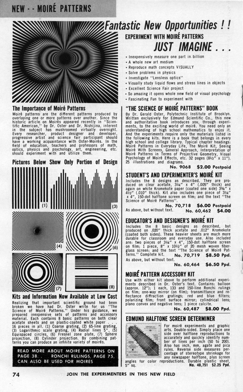 * * * * * * Starting in 1966, Edmund sold an expanded line of Dr. Oster's moiré product kits which included extra moiré patterns, some in larger image sizes and colors. This 1966 catalog had the exact same Page 74 as the 1965. It also had the "spider" on the cover, but that one is too large to match what went into Kappa:
