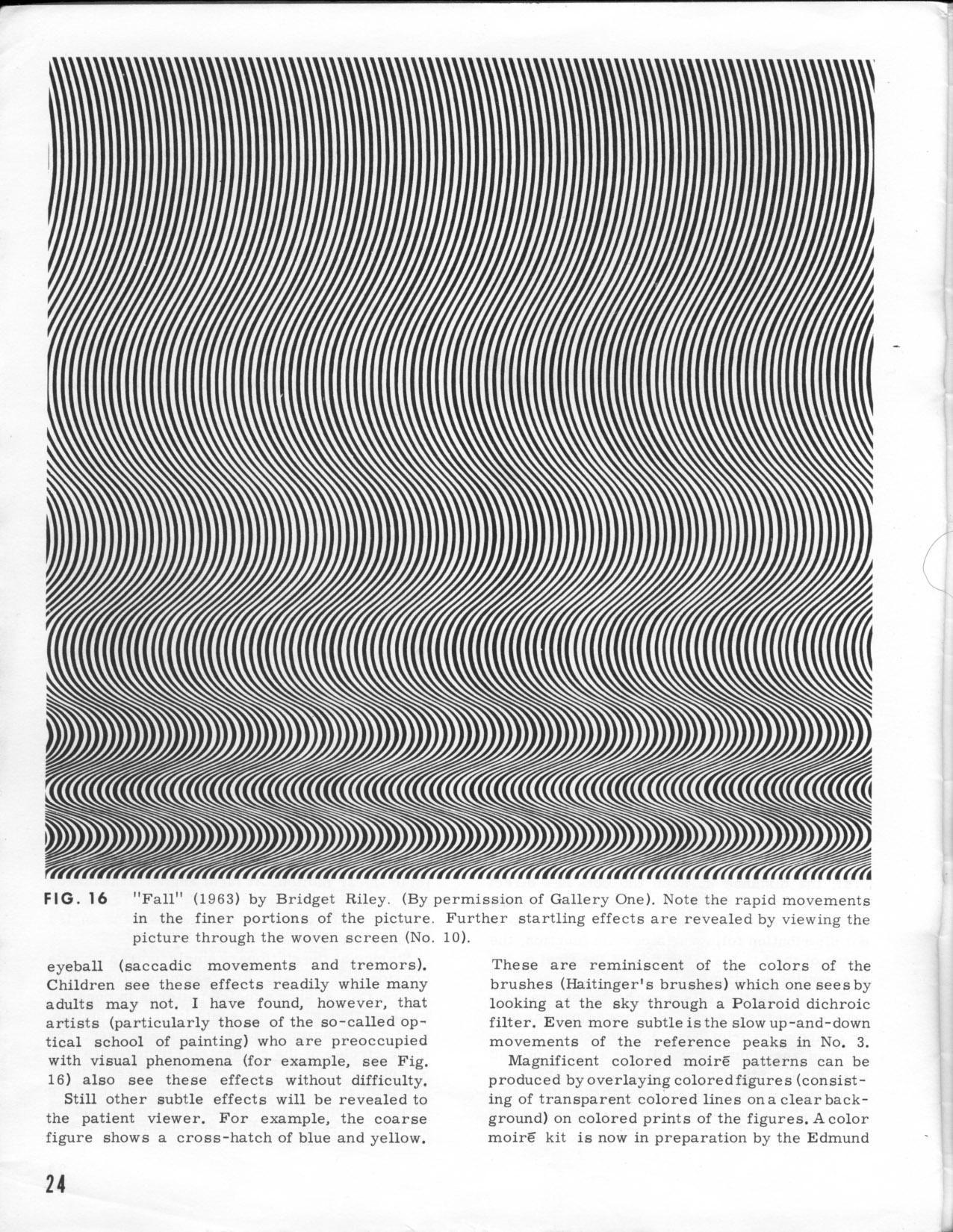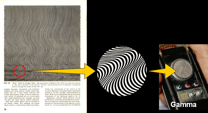 A year later, the afore-mentioned Dr. Oster observed the retinal-scrambling properties of Ms. Riley's work. To accompany his own patterns in his first (1964) edition of “The Science of Moiré Patterns” book, he printed her piece on the front and back covers, plus on Page 24. Each of the three "Fall" images (cover, Page 24, and back) is at a different scale, which allows us - by matching wavy lines seen in screen caps and other photographs - to determine exactly which ones Mr. Chang used. Even more specifically, since “Fall” was hand-painted, slight variations in line widths allow us to identify the precise location within that image they were cut from! So from the version appearing on Dr. Oster's book cover, Wah cut two circles (using an old-fashion radial compass that poked a hole at the center) and inserted them into Delta and Iota: