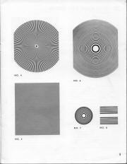 The pink seen on the cover of this first (1964) edition is on a plastic overlay held on by the bright red "report" clip on the bound edge. All pages of this 8.5"x11" book are reproduced at the bottom of this page for your studying pleasure. On its Page 9 we see a number of moiré patterns reproduced. The #4, while much more crude here on rough paper stock than on the smooth Kromokote in the kits, was nonetheless cut out and installed in Epsilon. Note the asymmetric blank patch surrounding the black dot in the center that confirms for us the exact source and also its rotational orientation in the prop: