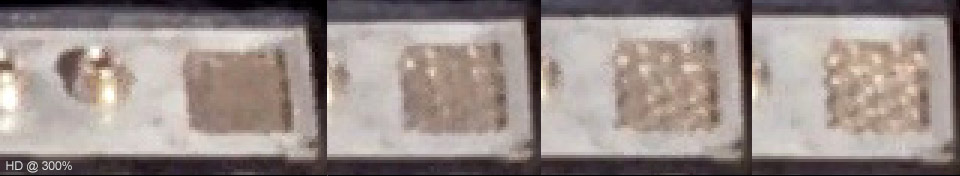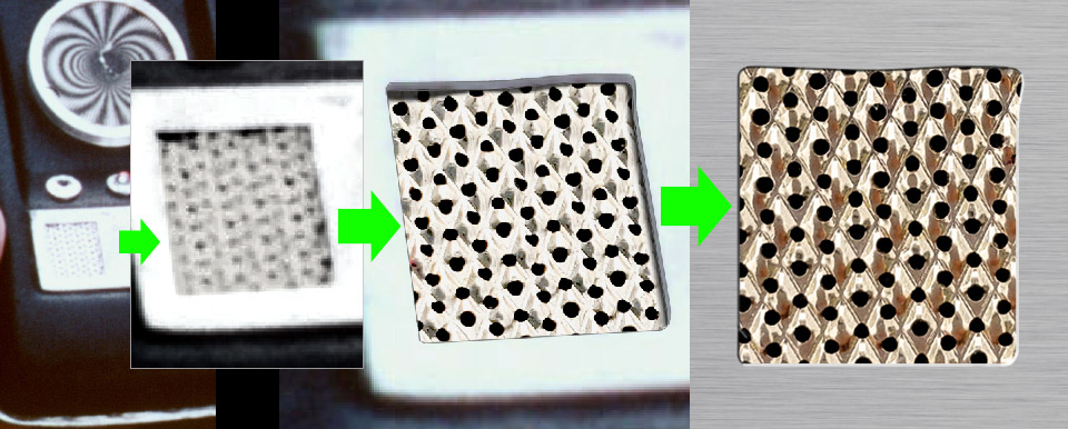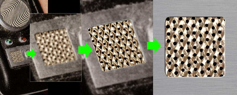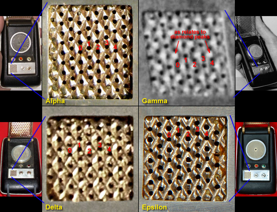 A surprising discovery has been made by our staff regarding a small and previously unassuming element of the communicator prop, the microphone grill (or "mic grill" in hobby parlance), that 1) allows you to make ever-more accurate replicas, and 2) demonstrates yet again without any ambiguity the assured authenticity of the the found Wah-built Alpha hero: How could we possibly know such a thing, given the hundreds of radios that had the diamond mesh? Because the speaker material in Wah's communicators is a different type than what's found on the Universal, Candle, Omegas, or for that matter 99.9% of all diamond-meshed vintage models. And what is this clear-cut difference that has eluded detection by all other prop experts for all these years? Simple actually, once you know to look for it. The hole spacing. Observe: In