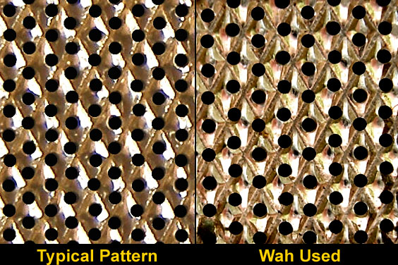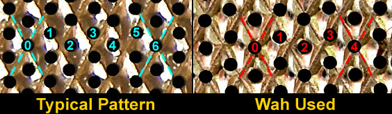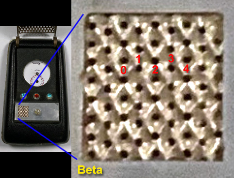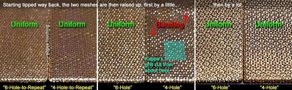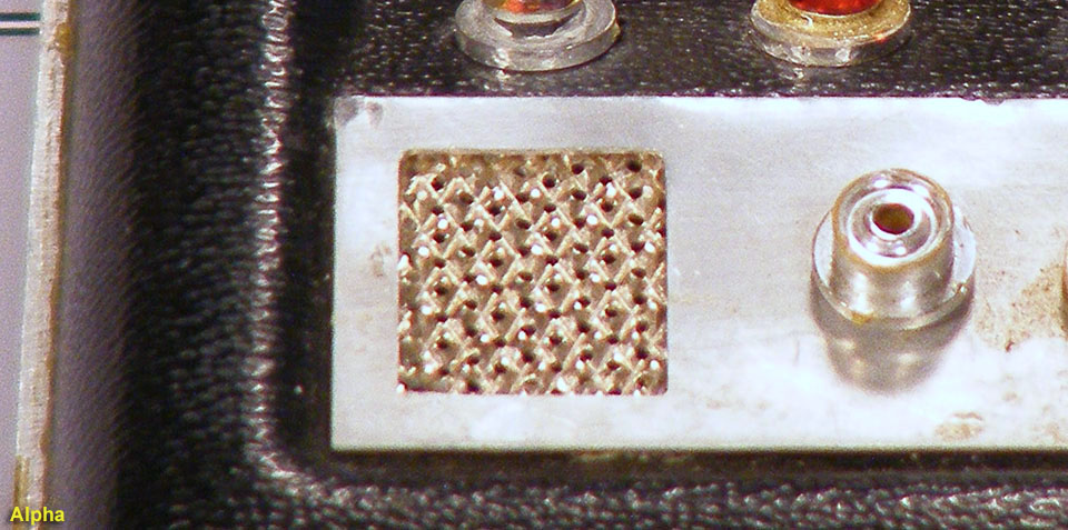adjacent columns: It cannot be imagined why this odd variant ever came into being from the vendors who supplied the stamped metal to radio manufacturers, and do be aware that there are yet more oddball hole arrangements and spacings out there, including one with an even greater hole-to-hole distance and another with parallel rows/columns instead of the usual staggered. As to why Wah used such an uncommon radio speaker mesh, it must simply have been what he had by chance lying around to strip down. However, what this ultra-rare selection in 1966 granted us at HeroComm when it was first discovered during our 2007 Alpha blueprint efforts (the hero tracings didn't match a pre-drawn grill from a Universal) was to see yet one more absolutely unmistakable tell in Alpha that is unique to only true authentic Wah-built comms. To illustrate this, below are grill photos from five known originals with the "horizontal hole-count test" superimposed. Note how it works out perfectly in every case:
