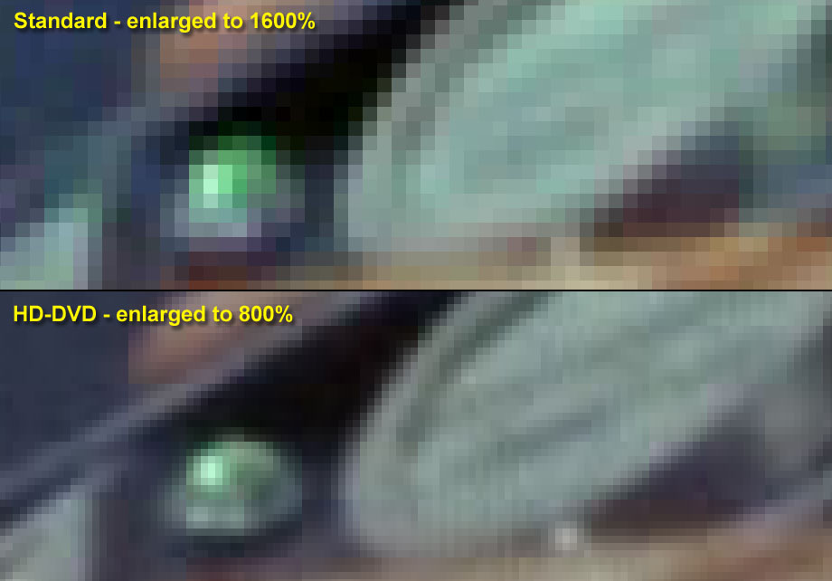 We've also seen the "maximum" that can be obtained with high definition compared to standard DVD. Simply put, when it comes to resolution, or the amount of raw data contained, there is no comparison... high def blows away standard. By how much? For every one pixel on Standard, HD delivers 4.5. That is nearly half a magnitude improvement! When astronomers get that kind of step up from a new telescope, they discover galaxies. Let's talk basics. Standard DVDs save their data as 720 pixels wide by 480 high per frame (below left). That's all you get; 345,600 "native" pixels. This format is called 480p; 480 for the height and the "p" for Progressive scan, simply meaning each line is refreshed after the last one (the other kind is "i" for Interlaced, where every other line is refreshed like in older TVs). However, since that native image has an aspect ratio (width / height) of 3:2 and a TV set has an aspect ratio of 4:3, a Standard DVD image has to be stretched vertically to be reconstituted into its proper shape, which is 720 wide by 560 high. Your DVD player will automatically do this, but no extra data is created (below right): To contrast, BluRay frames (stored in 1080p format) are 1960 pixels wide x 1080 high. That makes for a whopping 2,116,800 pixels. But that is for wide-screen movies. Again because TV is at a 4:3 ratio, BluRay cannot make use of the full width, so it only gives you 1440 pixels (1080 divided by 3 times 4). The unused portions end up as black bands to the left and right. That makes each frame of a classic Star Trek episode displayed at a still-impressive 1,555,200 pixels. As said before, that is exactly four and a half times more than Standard. Below are portions of the same frames from Miri illustrating just how much additional detail is now available to us. Note at a minimum here how nearly every antenna hole in the HD version can be made out separately: Enlarging a portion of each reveals the true detail we want... plus the undesirable artifacts from the digital compression used to reduce the file size on the disc: Wow! That sort of says it all. We hope for a few nice discoveries as all the episodes get explored in high definition. |