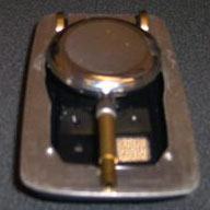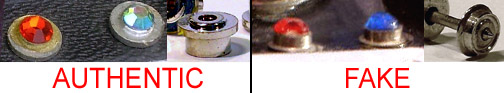 1. Pronounced brass antenna aging. Originals have so far been seen as still smooth and clean, with only a light patina. Not seen in this example, but sometimes the perforation holes are also the wrong size - being too large or too small. See below. 2. Antenna hinge wheels are large and crooked; the slots they fit into are cut both crudely and extend too far into the flat surface of the control recess. Originals had cleaner slots that end pretty much right at the bottom of the back recess fold. 3. The moiré insert is a complete two-layer radiating "spider" pattern. While this is seen in the motorized heroes, it has not been observed in any dummy, where the bottom paper layer has always been of a different pattern altogether (illustrated here). 4. Jewels are plastic instead of glass, lacking sparkle. Bright yellow, green, or blue are colors that are not found in any screen cap image. Often, they are mounted on inverted N-gauge train (instead of slot car) wheels, as shown here: