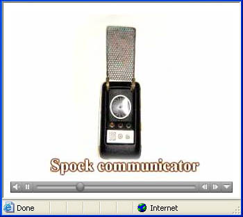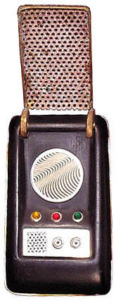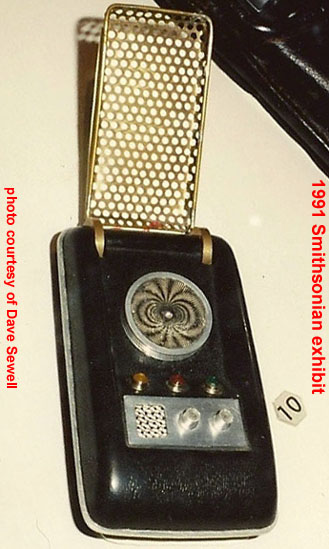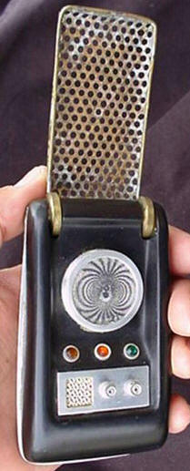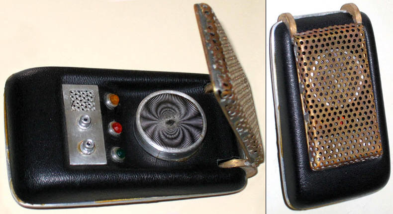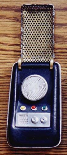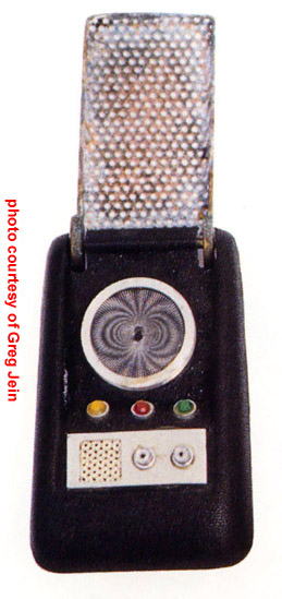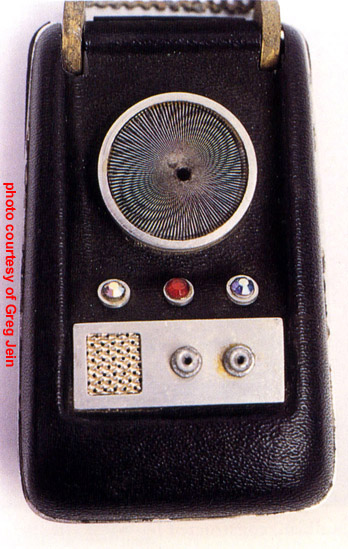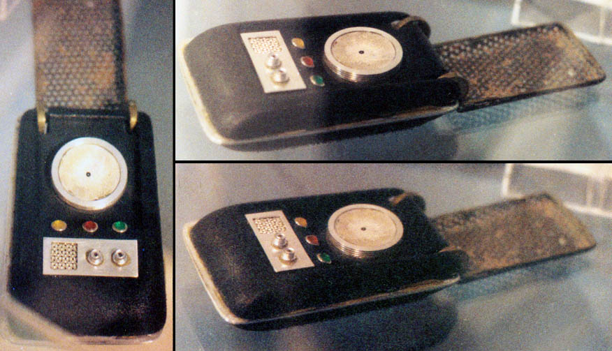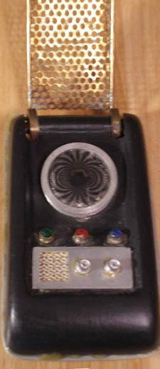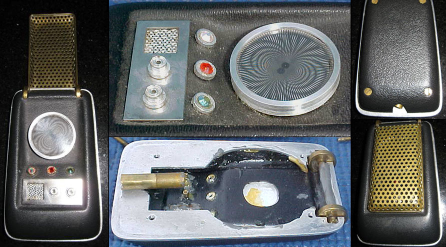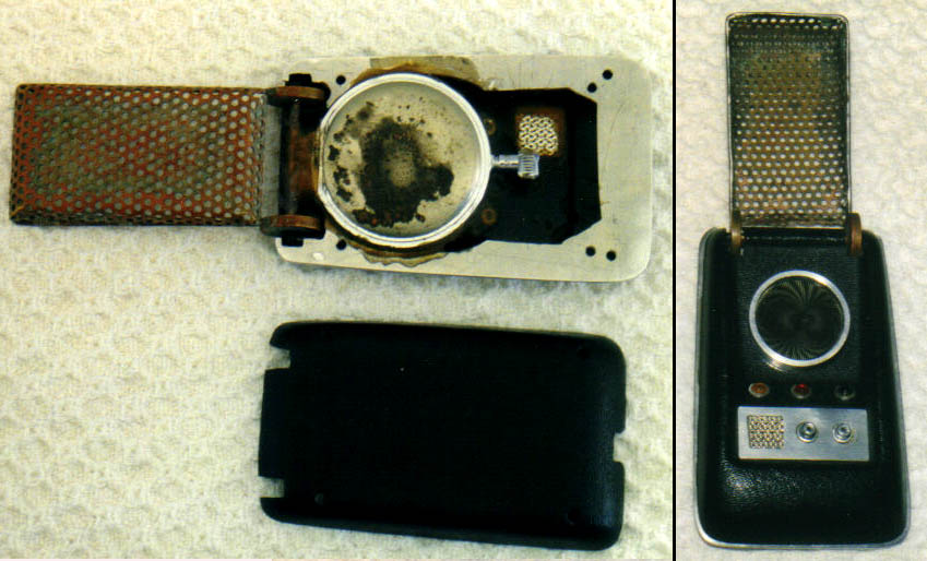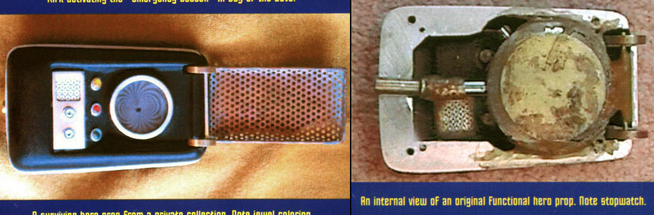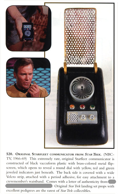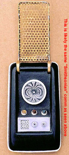 The owner of this hero prop above - which is pictured on a prominent Trek prop site - maintained this one was built by the studio shop at the beginning of the third season, since according to him, not enough of Wah Chang's ten communicators had made it that far in good condition. We consider his opinion to be wholly without merit, as the Alpha and Beta heroes (both working) as well as many of the dummies readily show up throughout the 3rd season. In contrast, no comm prop with hinge wheels protruding deeply into the control well recess as this one has (a consistent ME tell) is seen in the show - EVER! This combined with our knowledge that a well-known collector first purchased this very prop directly from Mark English (back before anyone knew better) informs us there is zero chance this is an authentic Star Trek prop. These photos above come from a Masterpiece Replicas booklet published with their 2004 communicator replica (their text is included to verify the source), in which no copyright restriction is stated. |