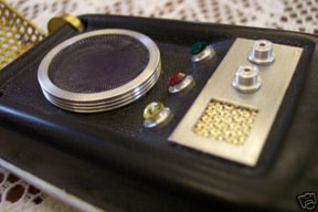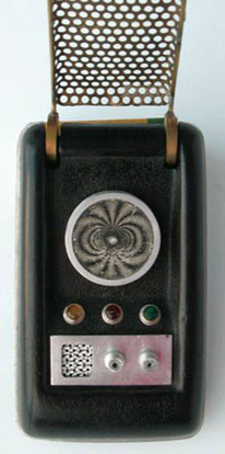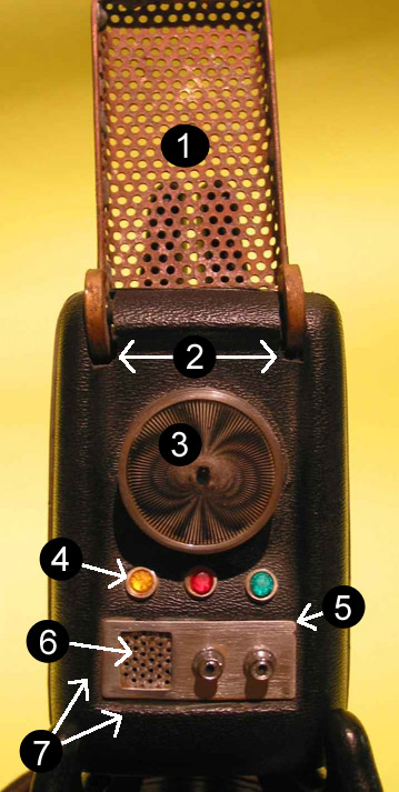 7. The lower left corner of the control well has the same outward bend error that Wah Chang had in his, but is far more pronounced. 8. (Not Pictured Here) A shiny shell. All original comms were made of a semi-gloss black Kydex with a fine left/right "haircell" texture (see this for a close-up.) Many fakes have a smooth, polished look. See right below for an example. |