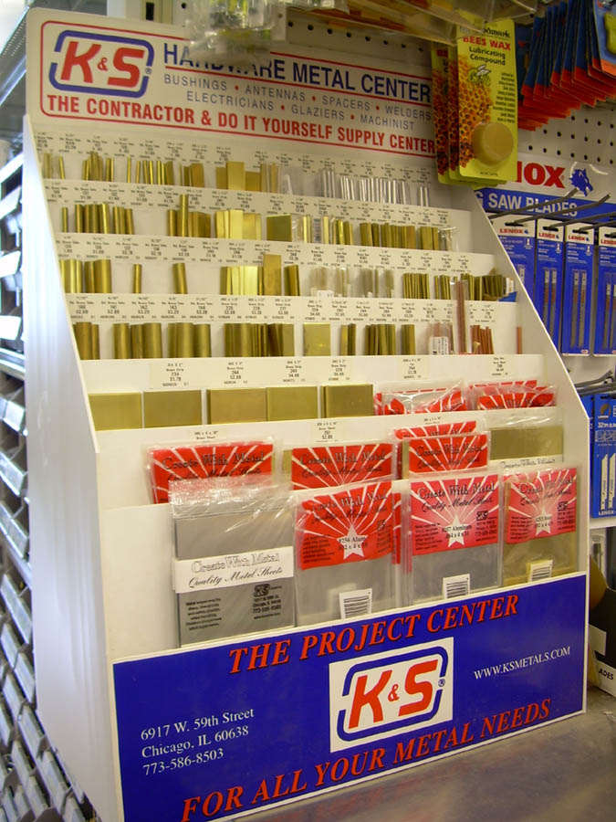 For a guide to assemble your parts, we recommend this unique step-by-step tutorial by YouTube member MrTrek64. Note that it contains additional features beyond our authentically-oriented scope, such as adding electronics and the use of modern adhesives over vintage-style. Nonetheless, you will no doubt find it highly informative and delightfully entertaining. Disclaimer - the gentleman makes it a point to thank us several time for offering information to help his build. We extend the appreciation back. When looking to buy the raw brass and aluminum materials referenced in the above sections, you can't do better than finding a well-stocked K&S "Hardware Metal Center," typically located at your local hobby store or (as shown below) at ACE Hardware. This one even had the odd-sized 7/32" dia. brass tube needed for the hero wind-up mechanism: |