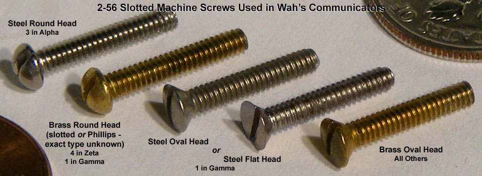 The three types of machine screws we've seen directly in an original Wah Chang communicator (in Alpha and Beta) are: 1) 1/2" brass 2-56 slotted oval head, 2) 1/2" steel 2-56 slotted round head, and 3) 1/2" brass 2-56 slotted pan head. The "2" in the 2-56 number is the national standard (ANSI) reference diameter and the "56" is the number of threads per inch. Here are Alpha's: And these are Beta's: Note: Zeta's screws were lost by former owner Greg Jein prior to anyone else seeing them. These three types, however, are not the only ones used in the comms. All told, there were likely five (a pan head in not shown here): In chart form, they sort out like this (as best as screencaps show): |