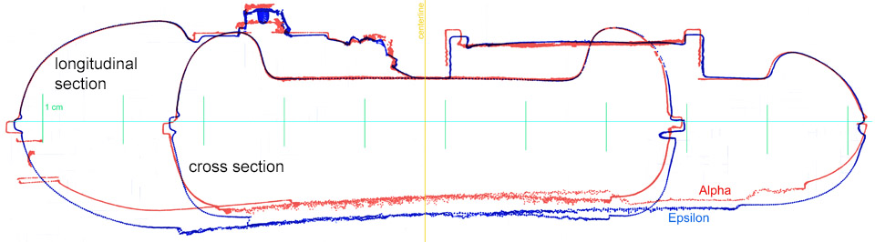 As to the actual vacuforming, you also have two choices: either go to a commercial facility and have it pulled by professionals or buy (or build) a rig yourself and do it at home. Ours is not at this time to provide a tutorial on the process, so if you are adventurous enough to opt for the later, we suggest starting with a book by Douglas E. Walsh called "Do It Yourself Vacuum Forming." This book is widely available on eBay and Amazon. A final note on the shells' trimmed height. All the top shells looked to have been cut and sanded down to about the same height. However, the depth of the bottom shells varied - the five comms fastened with screws were all were trimmed thinner (to allow the short screws to just reach the midplate) and so the other five whose lower shell was glued were cut more than a sixteenth of an inch deeper: |
