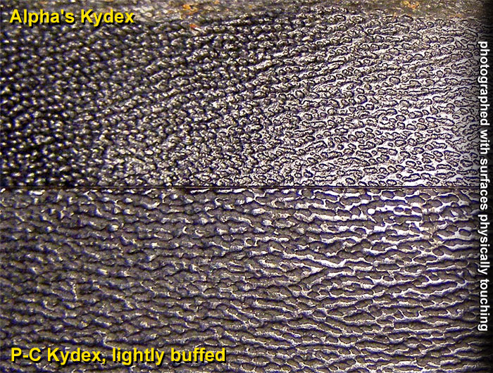 The black Kydex material Wah used is probably of the first grade made - Kydex 100 - but as you can see below, the "haircell" texture has been modified by the manufacturer, now being far more raised and linear... This is as close a match to the original texture as it gets today. There are two haircell styles; P-C Level and P-1; the two differences being that P-C is matte with an ever-so-slightly less rise in the texture grain, and P-1 has a gloss with just a bit more prominent a texture. Since the original Kydex Wah used has a distinct shine, we recommend using the P-1 and buffing down the peaks of the ridges with a flexible abrasive such as fine-grade steel wool or kitchen pad in advance of vacuforming (since doing so after always creates uneven patches at the tops and bottoms of the well curves due to dramatically different exposure to abrasive pressures). We don't recommend plastic polishing pastes, as the stuff is really hard to clean out of the texture's pits. We had a sample of the P-C with its ridges buffed to a mild shine with 0000 steel wool, and it looked like this below when held physically next to Alpha's bottom shell. Note the remarkable different of scale in texturing, plus how the matte finish in the modern P-C haircell's deeper valleys kept it from having an overall glossiness more in keeping with the original Kydex: