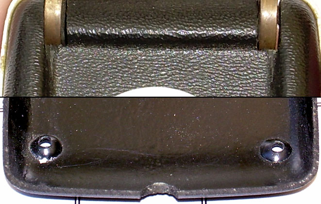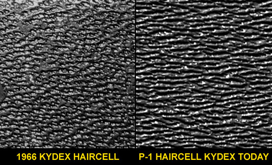 Our best information (without performing chemical testing) has the vacuformed shells being made from haircell-textured (on the outside side; the inner is smooth) sheets Kydex plastic, first introduced the year prior in 1965: While Kydex is still available today (it only comes in sheet form), the material has undergone several changes. It is now manufactured by a different company at a different location, and is available in many formulations, colors and textures (they occasionally drop or add one). The photo below is taken with a high-angle light source and is slightly larger than actual to accentuate the surface texture. Most have a matte (flat) finish but a few are glossy: