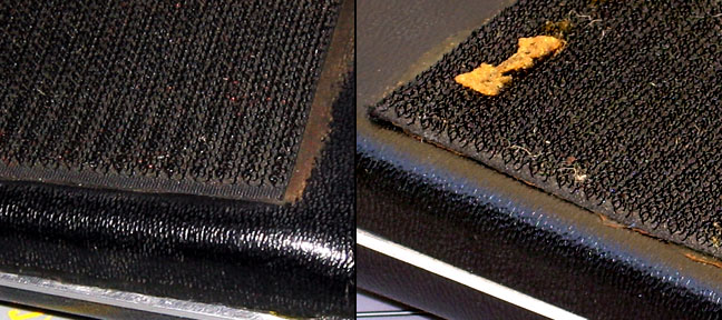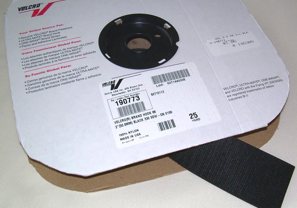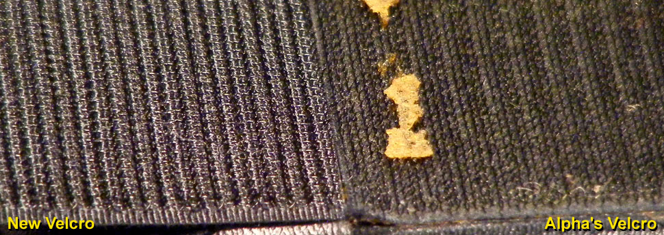 Attached on the underside of every communicator is a wide strip of black Velcro; the stiff hook side (the softer strip is on the costumes): As we learned from TrekPropZone member Alley, Velcro comes in two varieties: 1) a self-adhesive "industrial strength" tape, and 2) blank patches of varying size/color for sewing. It is the Velcro for sewing that was used on the comms. Note on the upper left picture the blank "hook-less" strip along one edge, a feature seen in today's sewing variety but not in the industrial tape. Also the bit of excess contact cement that oozed out onto the shell would not exist with a self-adhesive tape. The manufacturing style has changed over the decades, with the rows of hooks now farther apart and more evenly spaced: