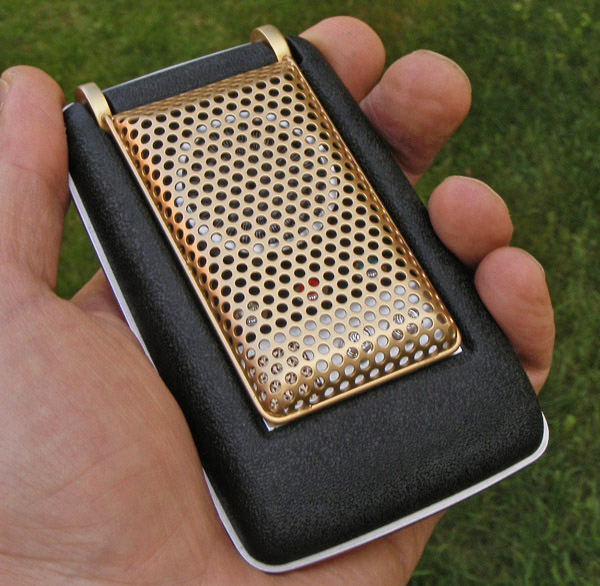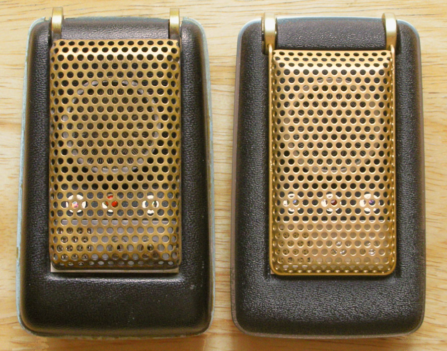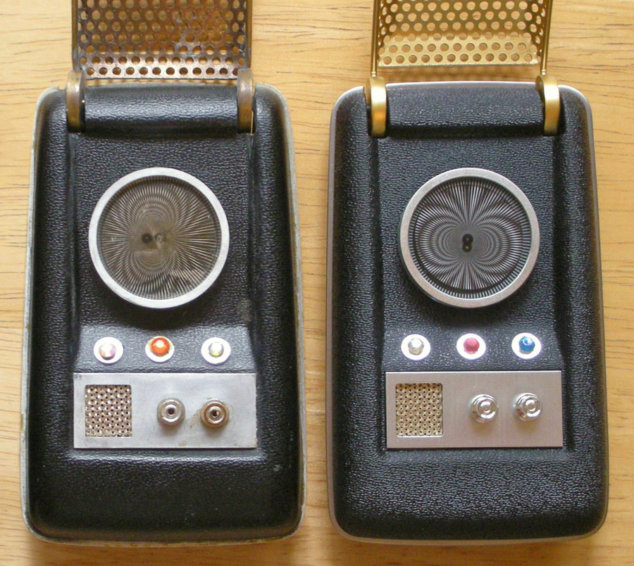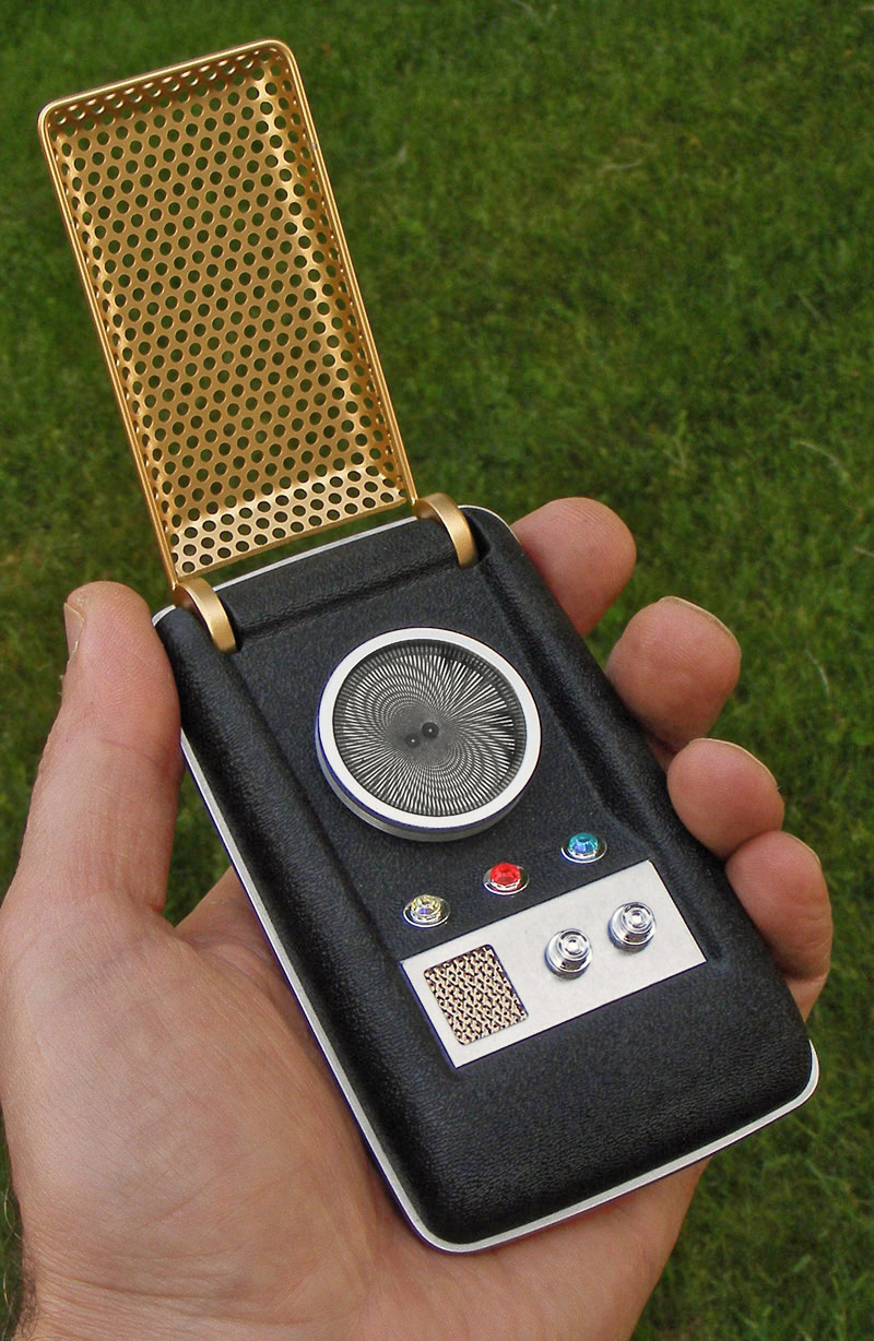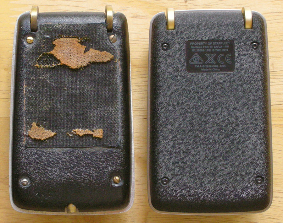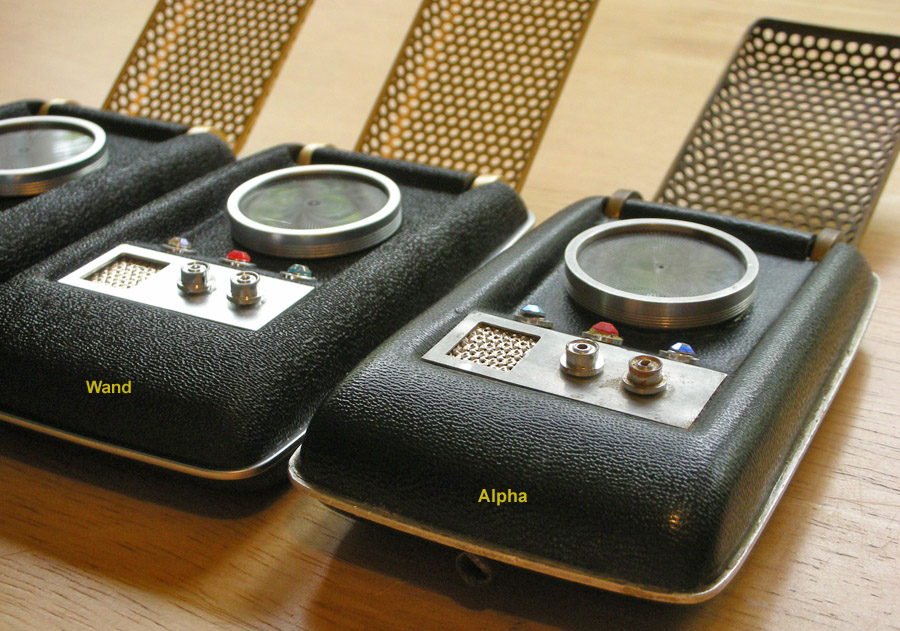 It was a privilege to have assisted the fine staff at The Wand Company in the making of their authentically-styled and functioning Bluetooth phone communicator, precisely modeled after the surviving Alpha hero prop. While 2016 saw museums putting the best of Star Trek on display behind glass, Wand has done something better - they've put it in your hand! They have faithfully recreated this beloved 1960s prop, along with its imagined 23rd century workings, all as a rugged device that also meets the expectations of savvy consumers today. For instance - and unlike every other replica prior - the circular "spidery" moiré pattern rotates in complete silence, and two subtle clutch points in the hinge were added to cleverly keep the antenna closed when closed and open once opened (the original lids flop around loose). Opening the antenna and hearing that iconic chirp - trimmed to three "pulses" like what you actually normally heard on the show - and then seeing a perfectly-replicated spinning moiré in the ring, is an absolute joy. But it doesn't end there. Sync it with your cell phone and 1) an incoming call is announced with the classic "boop-boop" tone, then 2) the opening changes to the second-most common four-pulse chirp. After that, just talk into the device like how you saw the landing party do. As true to a real Trek experience as you will ever live. They have posted a short story on how they came to make this phone prop here on StarTrek.com. And if you're curious as to how their comm stacks up next to the original, we have some side-by-side shots, courtesy of (former) TrekPropZone member Buddahaid. In the first three below, Wah's screen-used hero is on the left; the newcomer, on the right: