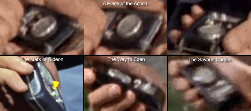 Moving on to the right jewel... later in "Miri" Spock flips open the comm, angled fortunately towards the viewer (Leonard often did that). There in shadow is the gem, and it's decidedly pink-ish: