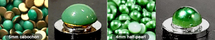It also seems to have had a white underside, since the bottom surface is reflected in the hub's chrome - and there's no hint of color there. An exhaustive online search unfortunately turned up not a single possible vintage source for this item. Swarovski did offer half-pearls, but to our knowledge their greens weren't at all similar, and the smallest size was a way-too-big 6 mm. Etsy now sells various old cabochons and modern plastic half-pearls that are reasonably similar, but for your replica Iota communicator you'll have to decide which of the three main characteristic (size, color or surface luster) you're willing to modestly forego: