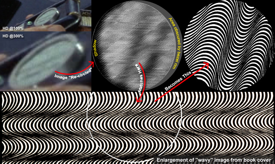 We determined this source and location for Iota by starting with its great "Miri" close-up that has the pattern at a shallow angle. Carefully "re-circling" it (restoring it to its actual shape and orientation) showed off in true scale the darker and lighter patches in its "bunching" lines. Nicely one spot in the book cover's "wavy" image matches almost perfectly each of the many dark/light spots (squint and you'll see it better): More