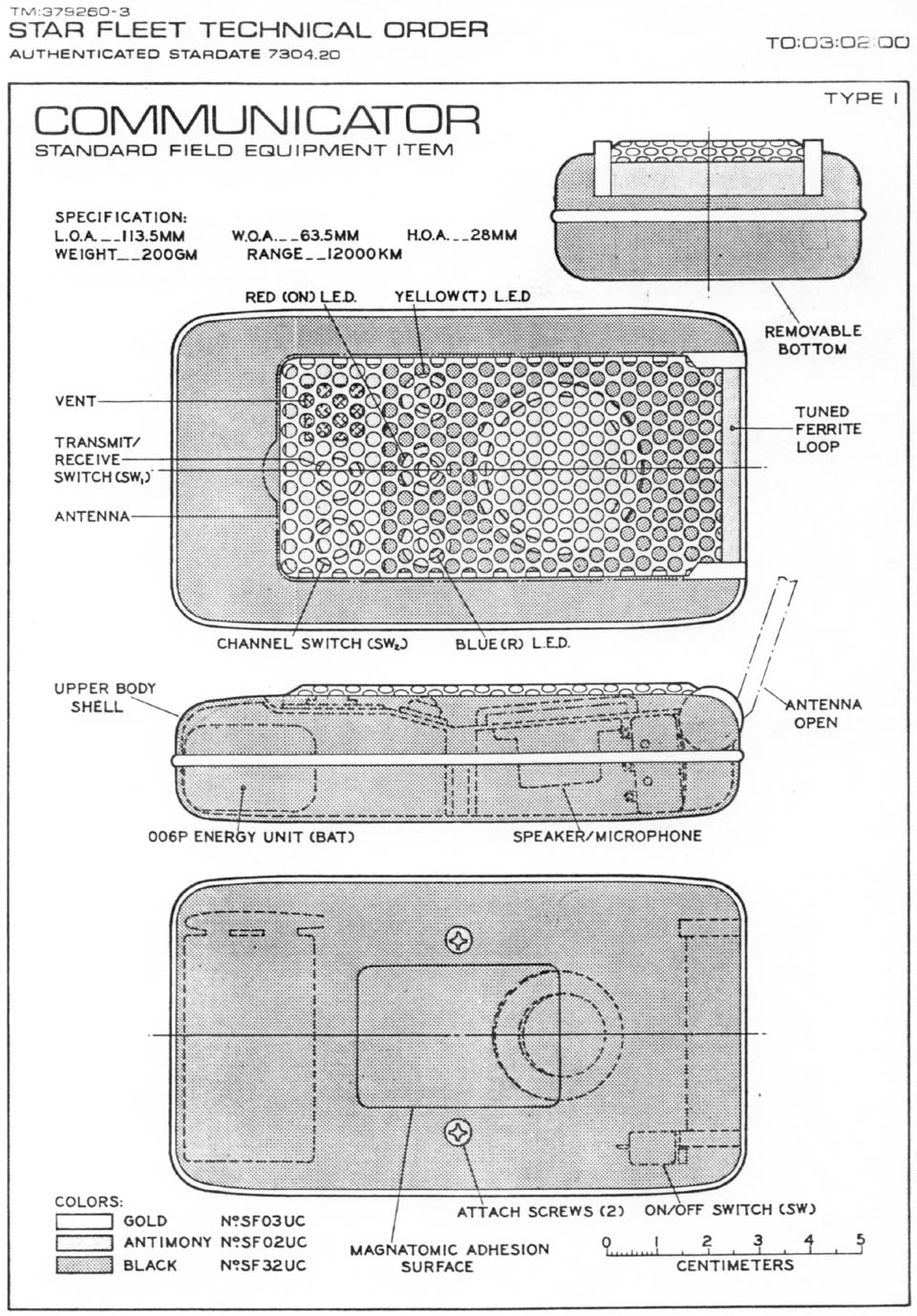 | Many of us growing up with classic Trek on our minds had a single resource to flesh out the technical aspects of the future world we saw: the Star Trek Technical Manual by Franz Joseph. Unfortunately, when drawings the props, he did not have any at hand to actually reference, so his plans were inaccurate in shape, dimension and detailing. Still, it was better than nothing, and in that spirit, we show below the Communicator page, complete with its operational specifications... |