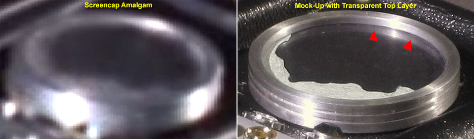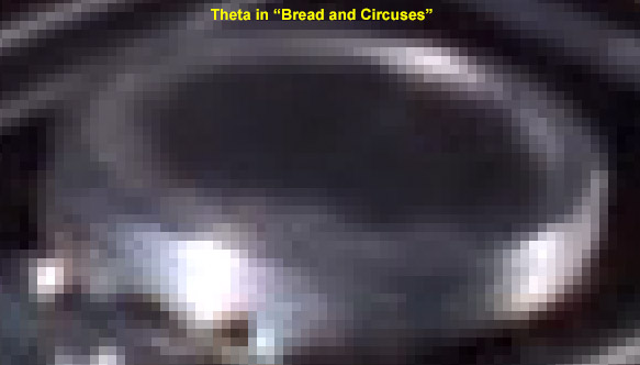Since the glue stain is there both before and after the change, the only possible explanation is that Theta had a 2-layer moiré assembly, only static. Wah must have originally installed (with excess glue) a clear transparency above a paper layer with a dull, thin-lined pattern that at any distance became a simple patch of light grey. Then sometime mid-2nd Season the bezel ring got knocked off from the shell, and while the top transparency remained glued in the ring, the bottom paper layer fell out - only to be replaced by some manner of black disk, thus the change from light to dark. This incident easily could have happened right there when filming "Bread," as the prop was likely flung repeatedly to the floor to get one good take. This theory failed instantly, however, when a mock-up showed a bright reflection of the bezel ring's upper lip off the clear transparency that isn't seen at all in screencaps: