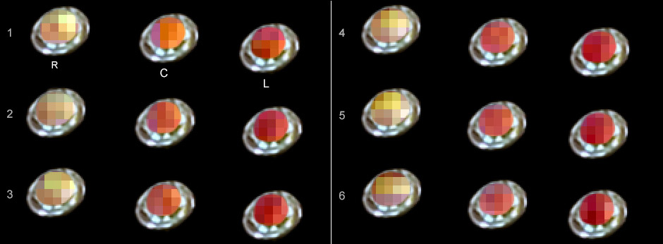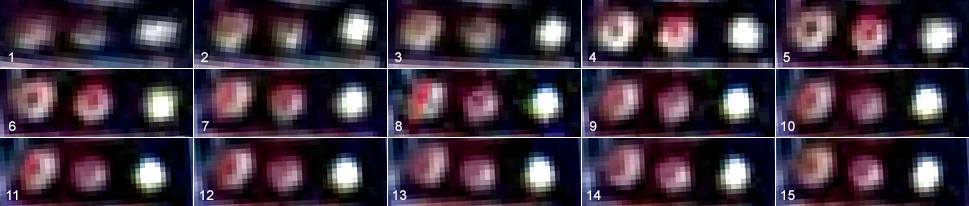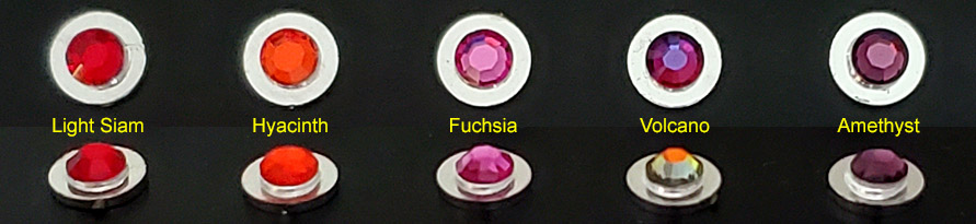 So is the center stone bright orange-red or deep purple? The clue that guided our choice is noting that in the fifteen time-sequenced frames above, Scotty's finger casts a moving shadow, as evidenced by the change in brightness of the jewels' surrounding bezel rings. This shadow shifts the look first of the left Light Siam and next the center gem. The question then becomes... can a bright Hyacinth in shadow appear purple? We experimented below where a finger puts a Hyacinth rhinestone into shadow, then the image size is reduced so the jewel (like in the sequence above) is but a few fuzzy pixels wide: