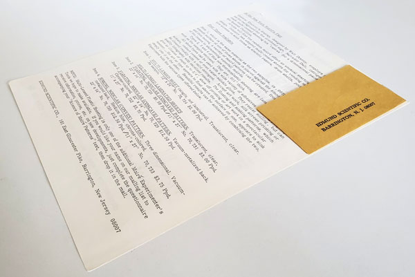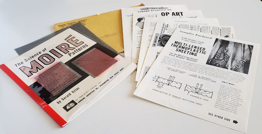 Such a change in appearance at different viewing angles can only come from either a lenticular (think of those old "3D" baseball cards) or a moiré effect, but what kind? We know the top isn't a transparency, and printed layers don't behave this way. About to throw in the towel, we took one last dive into our collection of all the Edmund Scientific materials Wah would likely have had access to, which included this complete "Experimenter's Moiré Kit with Booklet (Stock No. 70718)," from which six of his seven known paper moiré images were cut from (below is of course our copy, not his, which is not known to have survived):