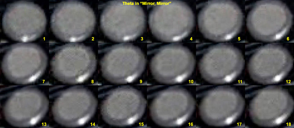 ... meaning the big glue stain seen in "Bread" wasn't there from the start; it was mere coincidence that a couple of the "Mirror" bright patches (whatever they are) appeared in similar locations near the bottom. This realization threw us back to square one, prompting a completely fresh look at, among other things, the individual frames from the Jefferies Tube scene. While the data in each is of very low quality - given the dim light level and small object size - something new was detected... a slight but consistent change within the moiré field as Scotty's hand movement alters our viewing angle of it. Note in particular the fairly blank circle in Frame 6 versus the distinct darker center patch in 12: