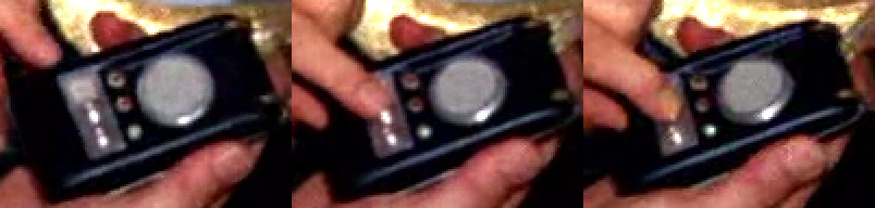 One could easily dismiss these frames as having no jewel color data whatsoever, but that would be incorrect. If we assume this is the same prop as in the preceeding low-angle close-up, that left jewel (on the right in these shots) should of course be Light Siam red. So what happens when we dial up the color saturation and the contrast? Do we see that color?