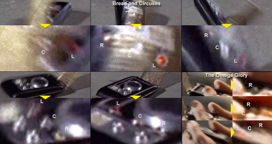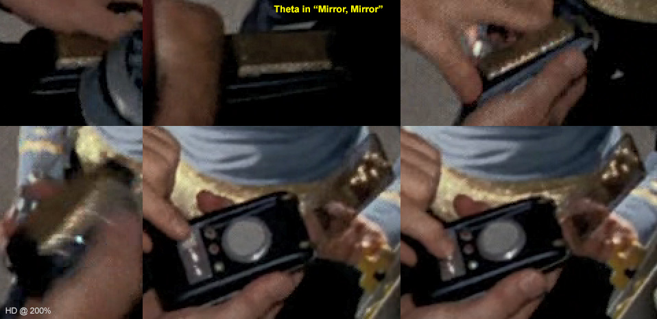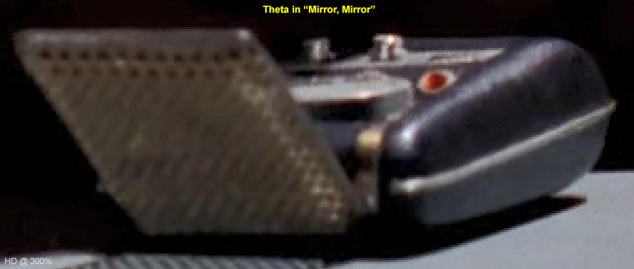 This communicator above with the bent antenna is either Theta or Iota, given its lack of screws and minimal midplate exposure. We're leaning 55/45 Theta, only because there may be a couple of solder marks here that are close to matching those that fleetingly flash in Theta while tumbling on the floor in "Bread and Circuses":