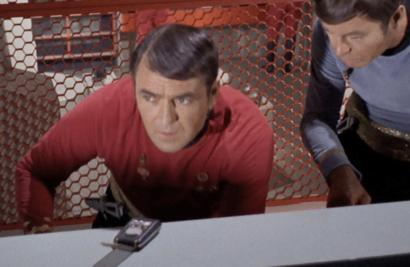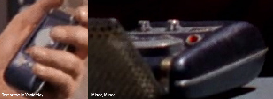 | This communicator is unique in that it's the only one with a red jewel in the left position, making the prop easy to spot from any half-decent view of its control well - which as it turns out are frustratingly few. At least that left rhinestone shows off big time in the great low-angle Mirror, Mirror close-up (below on the right):
