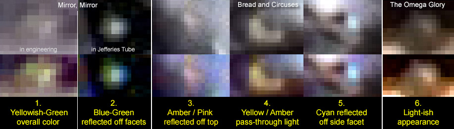 Clearly the center jewel is an orange-red and the right a yellowish-green. From this, figure at least the center is the usual 16ss Hyacinth. Or is it? Just a bit later in that episode, we see Scotty once again using the device, this time in the Jefferies Tube:
