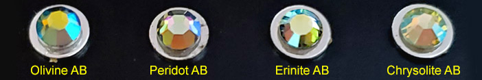 Of the four possibilities, the one rhinestone that best satisfies all six criteria above is the 20ss Olivine AB, see matching up here as it's viewed under different lighting conditions: