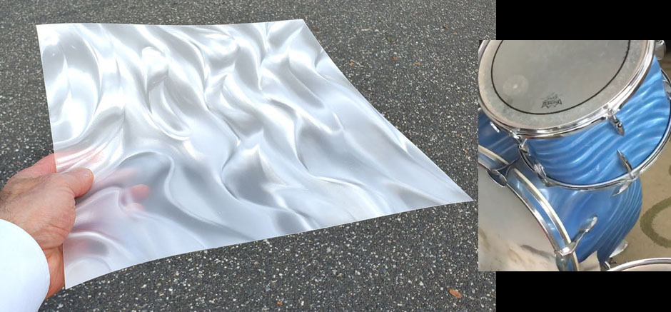 But where did this black disk come from? Did a studio worker cut one out from, say, some construction paper laying around? Maybe not. First, it's a precision task to trim a circle that just fits into the bezel ring, and that big bottom glue stain says the repair job wasn't precise. Second, why pick black when easily-available white paper would be much closer to the light plastic that was there before? So the other possibility is that Wah backed his prismatic layers with a black disk to ensure the pattern's appearance was maximized, and during the later repair the three-disk assembly was just carelessly stuck back in upside down. This theory also has a potential weakness in that you'd see in the moiré's earlier appearances a prominent dark spot from the glue fastening the black disk to the layers' underside, due to the glue's messing with the bottom prisms' reflective properties. However, Wah may have known of this trouble (from a failed first attempt?) and glued on the black disk at just its outer edge. So should the actual prop exist today, it's possible the plastic moiré layers are still there underneath. : * * * * * * * Now if you're wondering if this material is still available for replica builds, we're thrilled to report the original company, Rowlux, makes clear prismatic sheets with amazingly the same micro-lens density. Unfortunately the product today, their "Moiré Illusion Film," at a thickness of 0.015", comes with the two layers thermally pre-bonded at an angle that creates only large-scale ripples. You've seen this stuff before, perhaps covering drum sets...