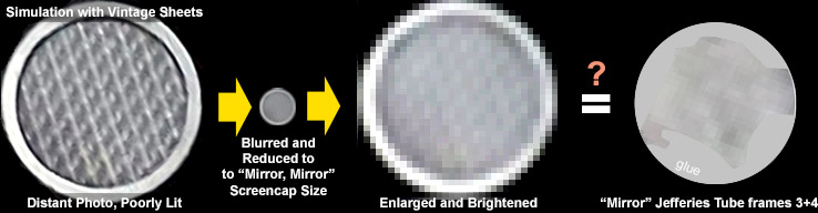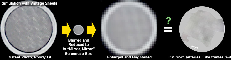 It seems Wah picked a more subtle pattern. Now across all the images we have from the "Mirror" Jefferies Tube scene, a single weak signal can be seen a handful of times of some mildly dark lines, always at an 11:00 o'clock-ish angle: