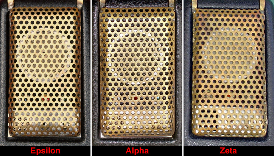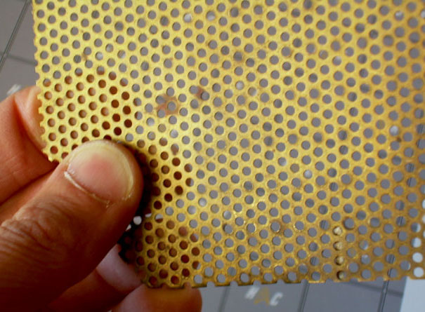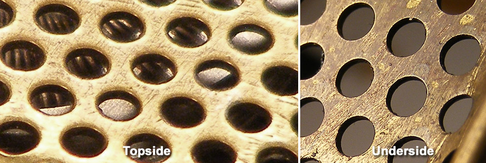 to get: Readily available from online/hobby/hardware stores is cartridge brass sheet at 1/32" (0.032") thick. That's fairly close - about 16% over - and that might do for many hobbyists, but the greater depth can make the holes appear smaller when viewed at an angle. If, however, you can find brass stock closer to 0.025, you'll likely be happier with the end results. To guide your drilling (hopefully using a drill press) forget using a center-punch to hand-mark all the 435 (29 rows of 15) hole centers (find here a template illustrating that pattern). Instead, obtain from McNichols or Accurate Alloys a small steel perforated sheet with the correct hole and spacing size and bolt it on top of your brass. Stack perhaps four to six brass sheets to maximize your hours of efforts. Have as your bottom sheet a piece of waste brass or aluminum, as the last sheet's holes tend to end up being a ragged mess. Now it's never been our intent to offer tutorials on how to build replicas, but we can at least share some helpful hints.... 1. Prep your holes. On Wah’s brass, the top surface has the hole edges softened with a slight roundness, whereas the underside the hole edges remain crisp and sharp: