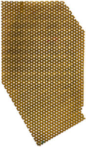 | The basic specs of the brass sheet installed in Wah's communicators are: Thickness: 0.027" average (varies between .025 and .029, depending on where the micrometer is placed) Hole Diameter: 0.078" (5/64") Hole to Hole spacing: 0.125" staggered Earlier we had a chance to examine, thanks to William Krewson, author of a 1995 Cinemafantastique Magazine article on Wah, the largest of the last remaining unused portions of the perforated brass sheet that went into the antennas. Photographs of the roughly 3"x6" sample, including a full size scan (at 300 dpi) on the right, are as follows: |