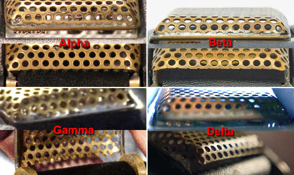 | We've seen two types and sizes of metal pins. In Epsilon and Zeta, it is likely steel, probably 3/32" (0.094) diameter and cut to about an 11/32" length. In Alpha, it is brass or copper 1/16" (0.063) diameter wire snipped to a maximum length of 5/16" with a pair of wire cutters (as presumed by the pointed beveled end). Where